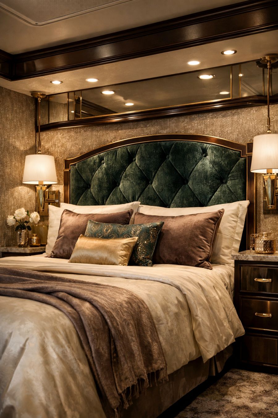 The bedroom offers a sanctuary of comfort and sophistication, with a plush velvet headboard serving as a striking focal point. The color palette is a harmonious blend of soft, muted tones, accented with touches of gold and deep jewel hues. Textured wallpaper adds depth and interest, while luxurious linens and rich fabrics create an inviting atmosphere. Ambient lighting and mirrored surfaces enhance the sense of space, creating a private retreat that exudes elegance and tranquility.