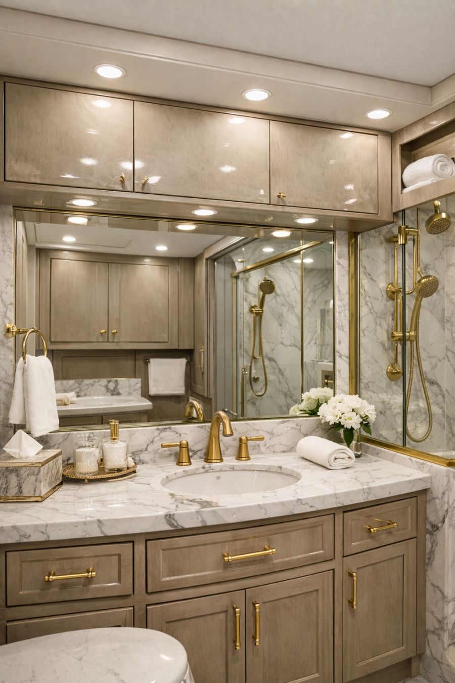 The bathroom is a study in luxury, featuring high-end materials and exquisite design. Marble surfaces and gold fixtures create a timeless elegance, while a large, frameless mirror adds a sense of space and light. The layout is both functional and stylish, with carefully chosen elements that enhance the room's practicality. Soft, neutral tones dominate the color scheme, providing a calming backdrop, while the overall atmosphere is one of serene sophistication and modern comfort.