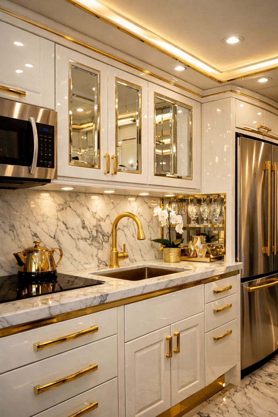 The kitchen is a masterpiece of design, combining form and function in a compact space. Custom cabinetry in a glossy lacquer finish reflects the elegance of the Hollywood Regency style, while state-of-the-art appliances ensure modern convenience. A polished marble countertop provides ample workspace, complemented by gold hardware that adds a touch of luxury. The strategic use of mirrors and lighting gives the illusion of a larger space, making the kitchen both practical and beautiful.