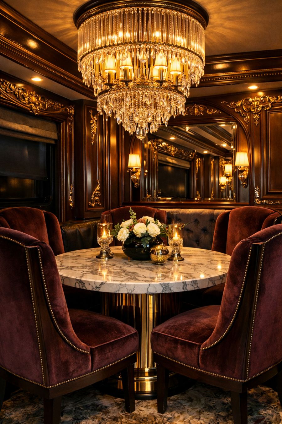 The dining area continues the theme of dramatic luxury, featuring a statement chandelier that casts a warm, golden light over the space. A round, marble-topped table stands as the centerpiece, surrounded by high-backed chairs upholstered in deep, plush velvet. The walls are lined with intricate moldings and gold leaf details, reminiscent of a bygone era of Hollywood glamour. This intimate space invites gatherings and conversations, making every meal feel like a special occasion.