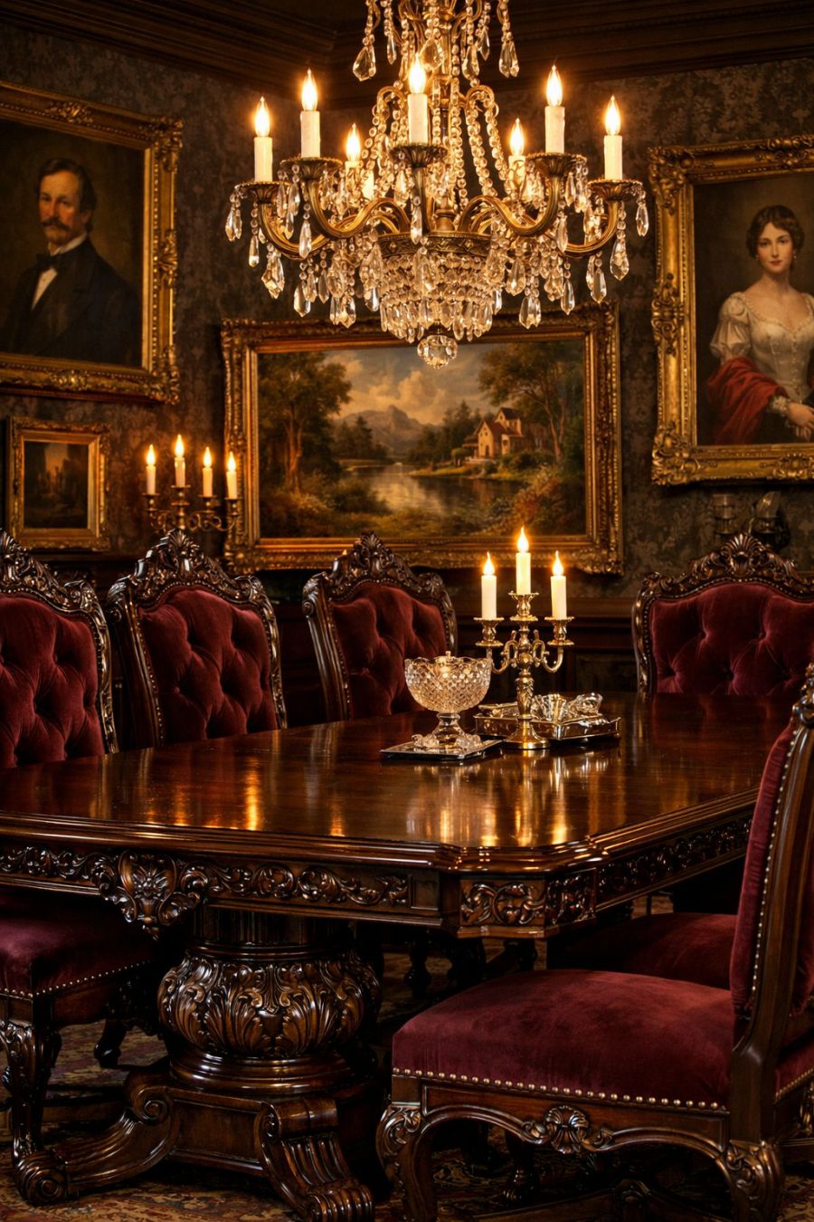 The dining area continues this Victorian theme with a large, intricately carved mahogany dining table as its centerpiece. Surrounding the table are high-backed chairs upholstered in deep burgundy velvet, inviting guests to sit and enjoy an elegant meal. A grand chandelier hangs overhead, casting a warm glow that dances off the polished surfaces of the room. The walls are adorned with vintage portraits and landscapes, each framed in ornate gold, further enhancing the historical ambiance of the space.