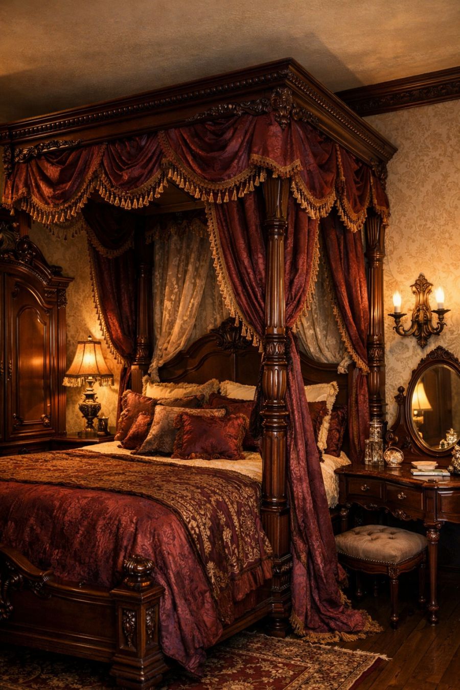 Stepping into the bedroom is like entering a Victorian sanctuary. The centerpiece is a grand four-poster bed, draped with luxurious silks and lace in deep, rich tones. Dark mahogany furniture, including an ornate wardrobe and a delicate vanity, complement the room's theme of elegance and sophistication. The walls are covered in a subtle damask wallpaper, adding texture and depth without overwhelming the senses. Soft lighting from antique sconces provides a gentle glow, creating a warm and inviting atmosphere perfect for relaxation.