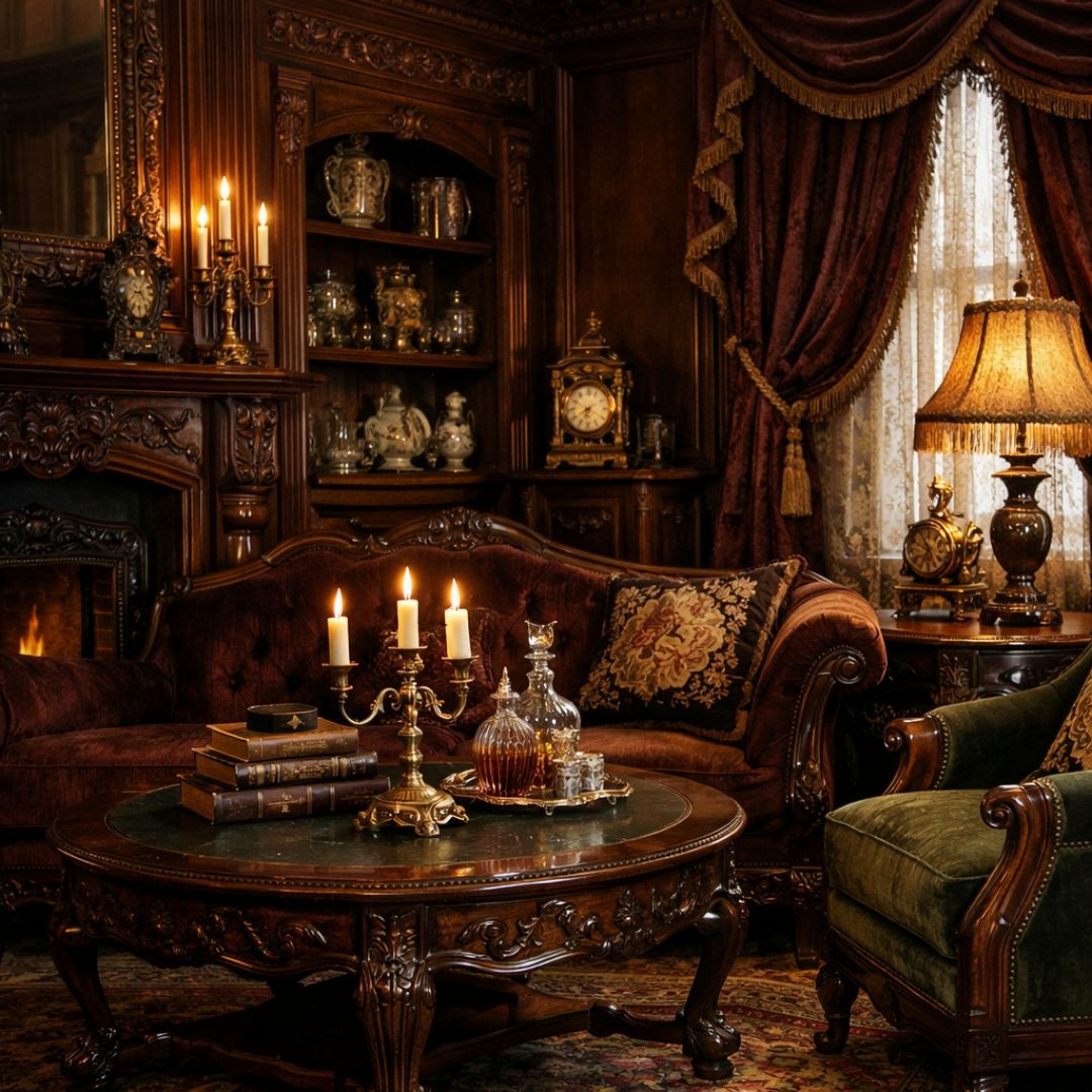 Upon entering, the living area is a stark contrast to the cottage's exterior, enveloped in a dark mahogany Victorian interior. Ornate crown moldings and intricate woodwork adorn the walls, creating an atmosphere of opulence and timelessness. Rich, velvet drapes frame the windows, allowing just the right amount of light to softly illuminate the space. Antique furniture pieces, each with their own story, are meticulously placed to maintain the historical authenticity and grandeur of the Victorian era.