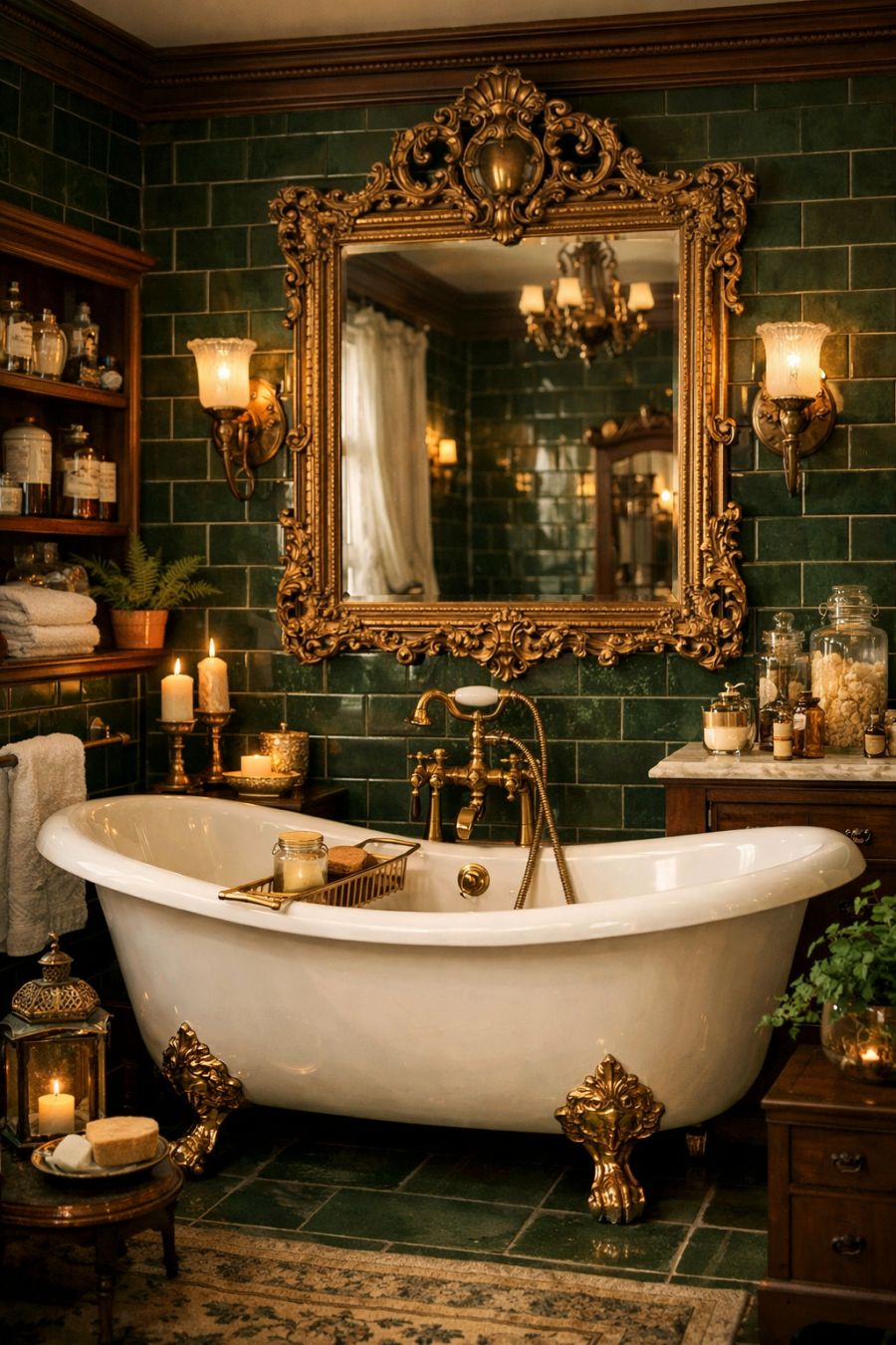 The bathroom is a study in Victorian luxury, featuring a clawfoot bathtub that takes center stage. The walls are lined with deep green tiles, reminiscent of lush Victorian gardens, providing a rich backdrop for the space. Brass fixtures add a touch of vintage charm, while a large, intricately framed mirror reflects the room’s elegance. The layout is both functional and stylish, with ample shelving for essentials and decorative elements like small potted plants and period-appropriate toiletries, creating a serene and sophisticated atmosphere.