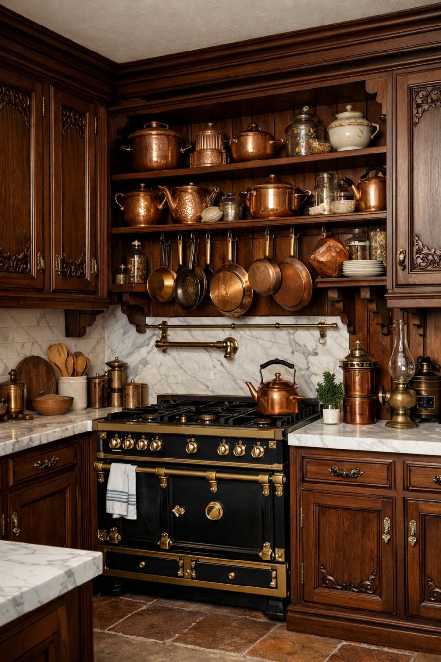 The kitchen is a harmonious blend of modern convenience and Victorian charm. Dark wooden cabinetry lines the walls, each cabinet door featuring delicate filigree work. A large, vintage-style range sits prominently, reminiscent of a bygone era yet equipped with the latest culinary technology. The countertops are made of polished marble, their pristine whiteness providing a striking contrast to the rich wood tones. Open shelving displays an array of copper pots and pans, completing the look of a traditional, yet functional, Victorian kitchen.