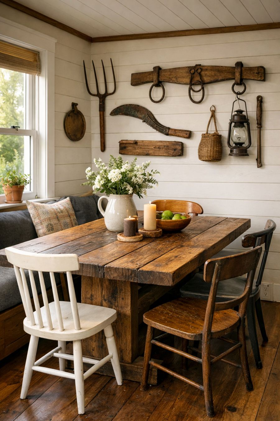 Adjacent to the living area, the dining space exudes a rustic charm with a modern twist. A reclaimed wood dining table takes center stage, surrounded by mismatched chairs that add character and charm. The walls are adorned with subtle decorative elements, including vintage farm tools repurposed as art. Large windows flood the area with natural light, highlighting the rich textures of the wood and creating an inviting space for gatherings.