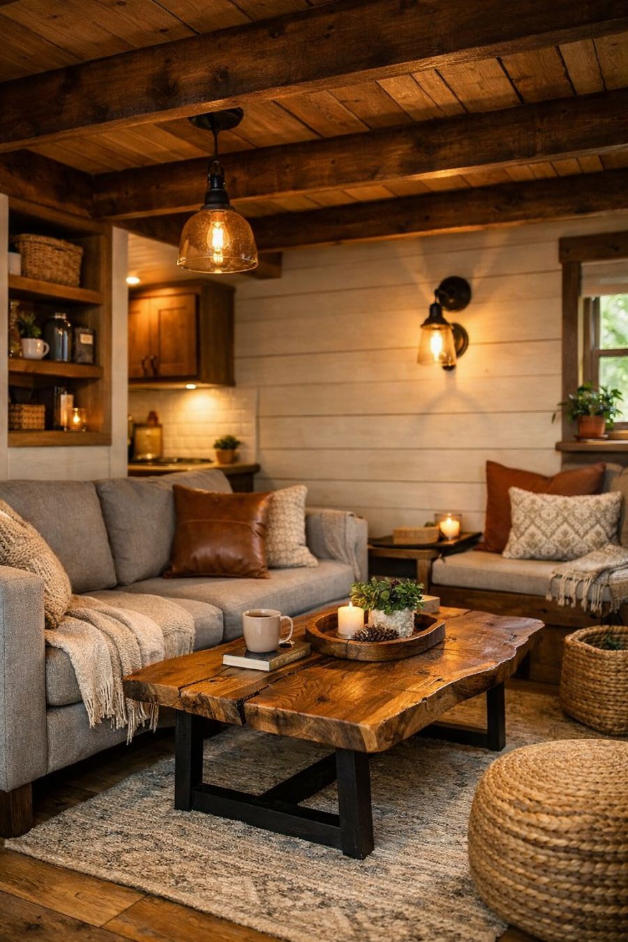 Step inside, and the living area unfolds as a warm and inviting space, defined by its open layout and thoughtful design. Exposed wooden beams stretch across the ceiling, echoing the home's rustic exterior. A cozy seating arrangement, with plush couches and a handcrafted coffee table, invites relaxation. Subtle lighting fixtures cast a gentle glow, enhancing the natural wood tones and creating an ambiance that feels both timeless and contemporary.