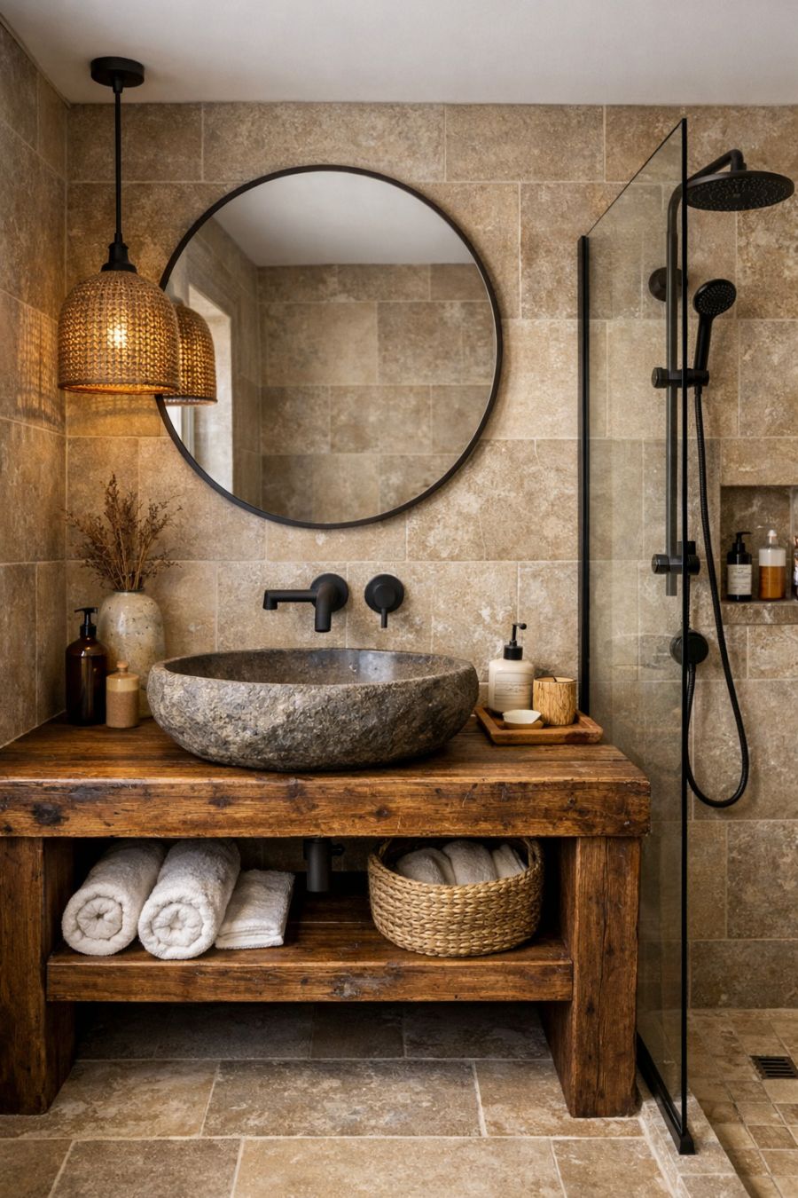 The bathroom is a harmonious blend of rustic textures and modern elegance. The space features a reclaimed wood vanity with a beautifully crafted stone basin, offering a natural yet refined look. Neutral, earthy tiles line the walls and floor, creating a cohesive and serene environment. Modern fixtures, including a sleek showerhead and minimalist taps, complement the rustic elements. The thoughtful layout ensures functionality while maintaining an air of understated luxury.