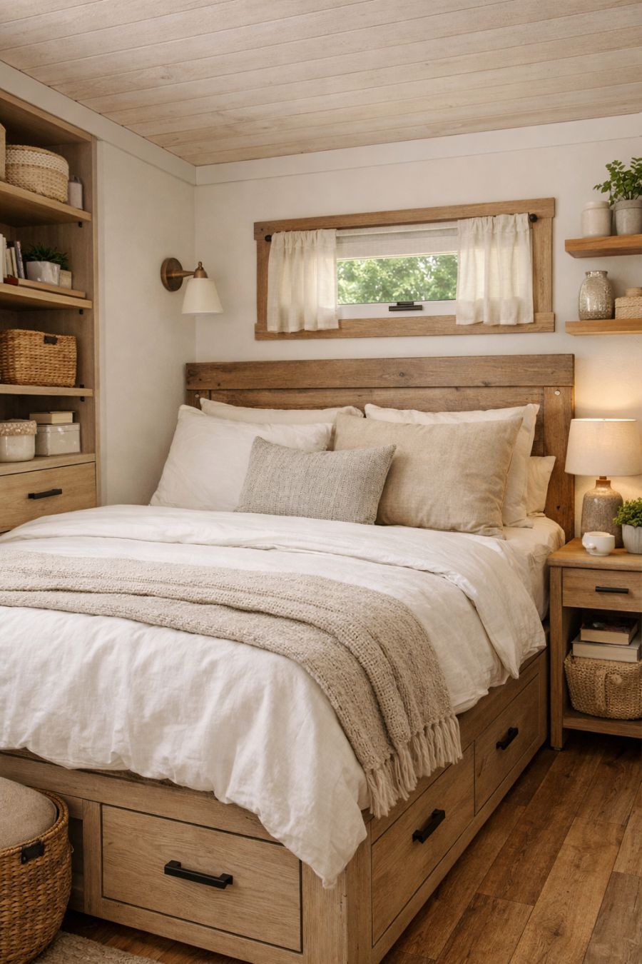 The bedroom is a serene retreat, offering a peaceful escape from the hustle and bustle of everyday life. Soft, neutral tones dominate the space, with natural wood accents enhancing the cozy atmosphere. A comfortable bed, dressed in crisp linens, invites restful slumber. Clever storage solutions, including built-in shelves and drawers, maximize space while maintaining a clean and uncluttered look. The design seamlessly marries rustic charm with modern comfort, creating a haven for relaxation.