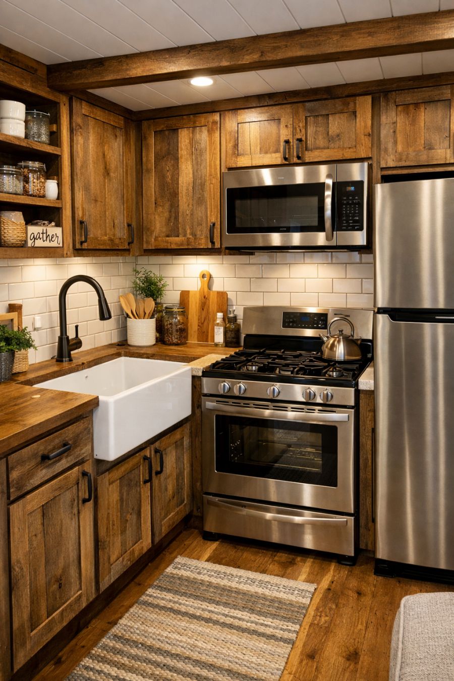 The kitchen is a perfect blend of functionality and style, where rustic elements meet modern conveniences. Reclaimed wood cabinetry offers ample storage, while sleek countertops provide a durable workspace. A farmhouse sink and stainless steel appliances add a contemporary touch, without detracting from the home's rural charm. The thoughtful layout ensures that everything is within easy reach, making meal preparation a pleasure in this beautifully crafted space.