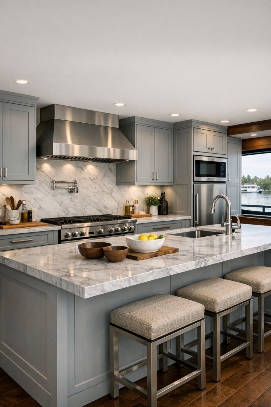 The kitchen is a chef's dream, combining state-of-the-art appliances with sleek design elements. Custom cabinetry in a soft, dove gray hue provides ample storage, while the polished marble countertops offer both beauty and practicality. A central island doubles as a breakfast bar, inviting casual gatherings and culinary creativity. Stainless steel fixtures and a high-end stove add a professional touch, making the kitchen as functional as it is beautiful. The thoughtful layout ensures that everything is within easy reach, enhancing the joy of cooking and entertaining.