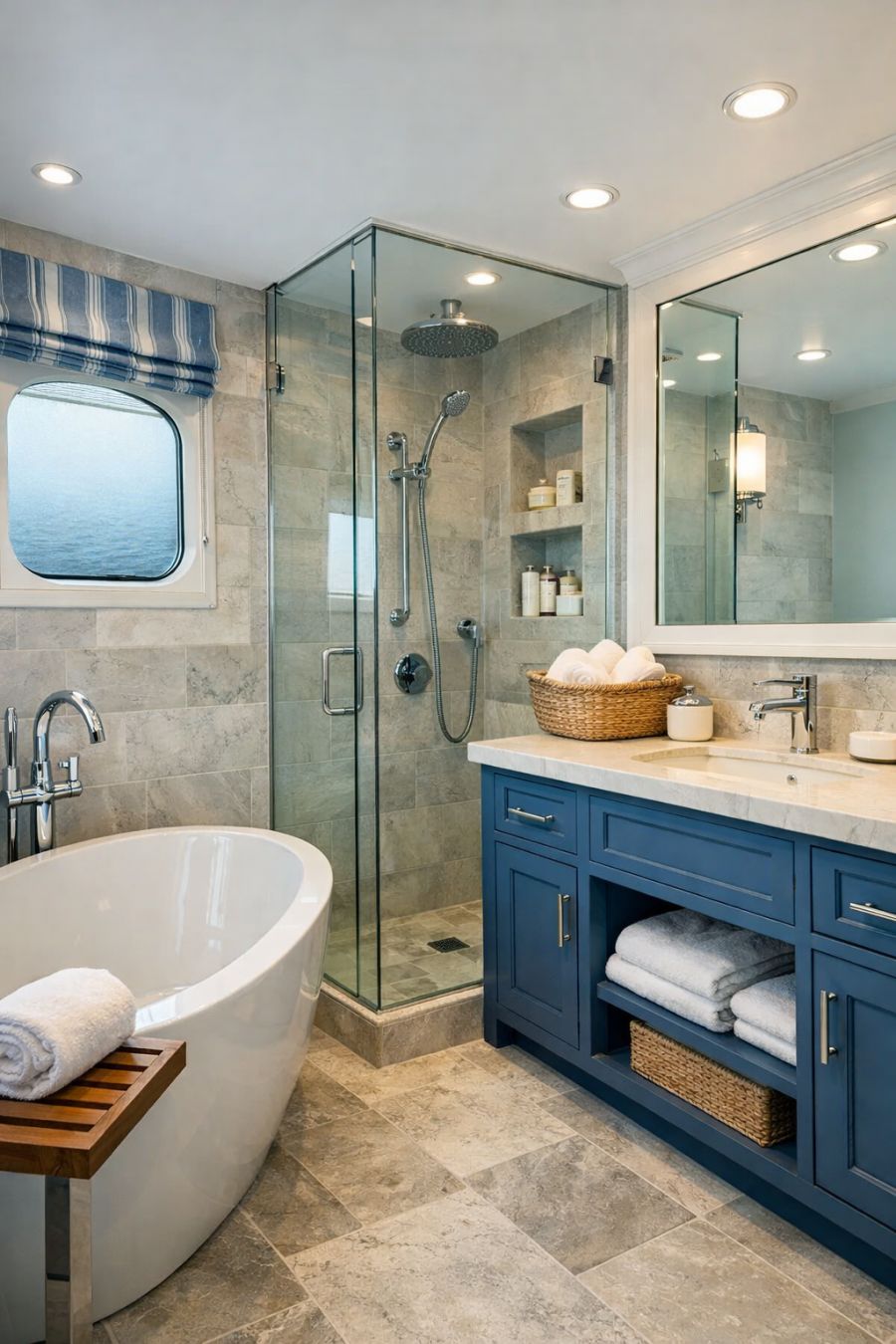 In the bathroom, elegance meets functionality in a space that exudes modern sophistication. The color scheme centers around cool blues and warm whites, evoking a sense of calm and cleanliness. Sleek, chrome fixtures and a spacious walk-in shower add a contemporary touch, while a deep soaking tub invites relaxation. Natural stone tiles line the floors and walls, offering both beauty and durability. Thoughtful storage solutions and a large mirror enhance the room's functionality, making it a practical yet stylish retreat.