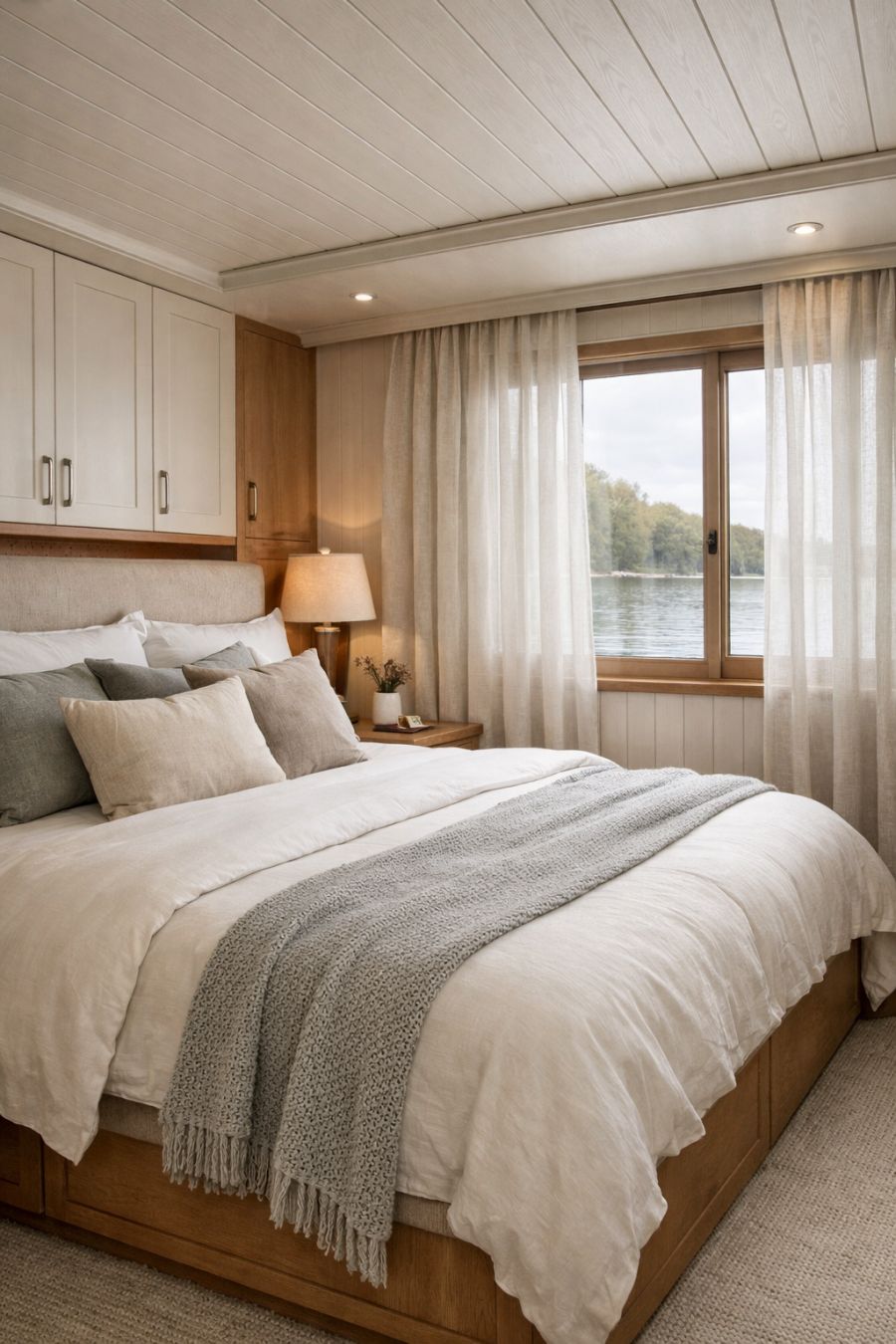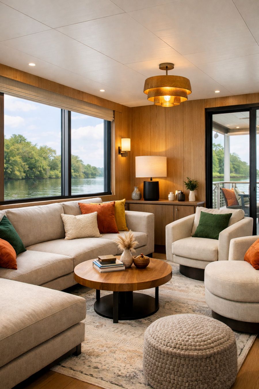 Upon crossing the threshold, the living area unfolds as a masterpiece of interior design, where modern elegance meets cozy warmth. The space is adorned with plush seating in neutral tones, accented by vibrant cushions that echo the colors of nature outside. Large windows flood the area with natural light, offering panoramic views of the water and lush surroundings. The walls, clad in light wood paneling, provide a warm backdrop that complements the sleek, minimalist furniture. Artful lighting fixtures cast a soft glow, creating an inviting ambiance perfect for relaxation or entertaining guests.