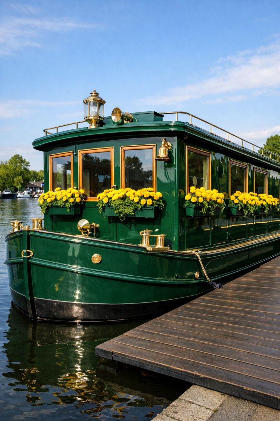 The exterior of this houseboat is a striking vision in glossy emerald green, its steel structure exuding strength and stability. From an amateur photographer's perspective, the 3/4 angled view captures the houseboat's elegant profile and meticulous design. Brass fixtures glint in the sunlight, adding a touch of vintage sophistication to the modern facade. Overflowing yellow ranunculus in the window boxes bring a burst of cheerful color, contrasting beautifully with the deep green paint. The flat, step-free boarding area invites you to transition effortlessly from land to water, promising ease of access and a welcoming atmosphere.