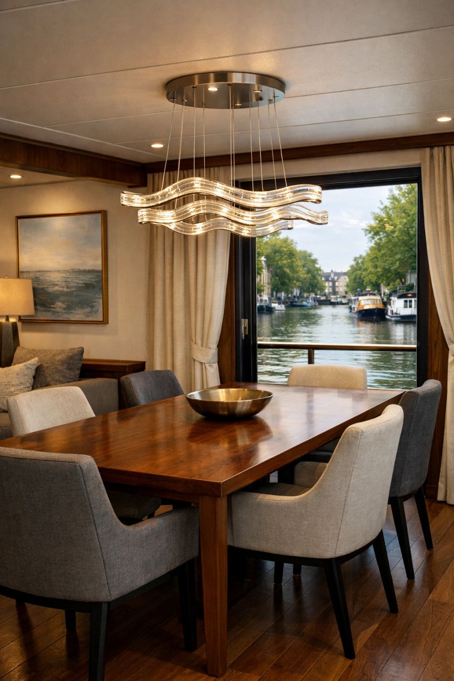 Adjacent to the living area, the dining space continues the theme of understated elegance and functionality. A polished wooden table takes center stage, surrounded by contemporary chairs that offer both comfort and style. Overhead, a modern chandelier adds a touch of luxury, its design inspired by the gentle ripples of water. The walls are adorned with subtle artwork, enhancing the serene atmosphere without overwhelming the space. Large windows ensure that every meal is accompanied by stunning views of the canal, making dining a truly immersive experience.