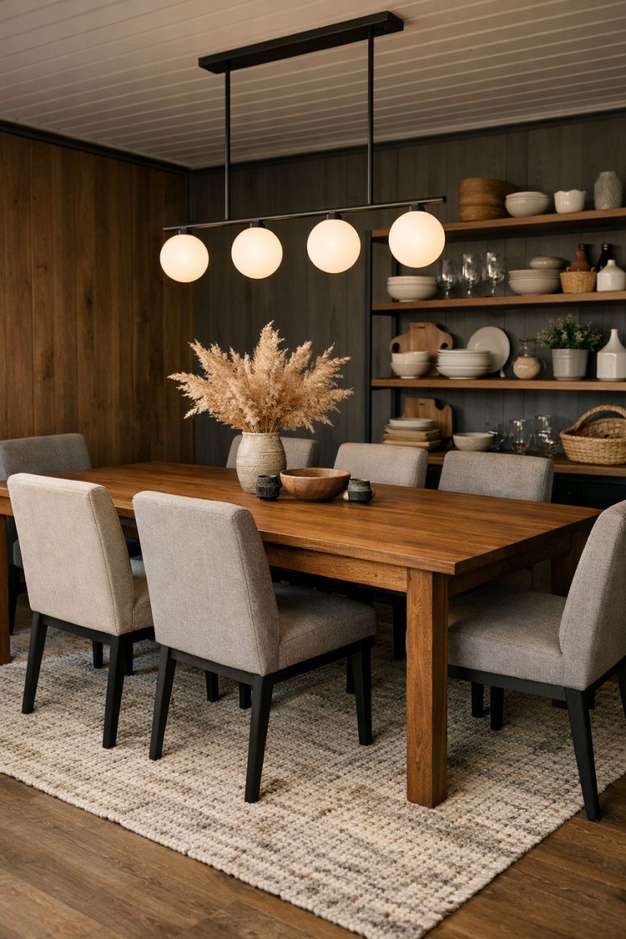 The dining area is an epitome of understated elegance, featuring a sturdy wooden table that comfortably seats six. The chairs, upholstered in a soft, muted fabric, offer both style and comfort, inviting lingering conversations over meals. A minimalist chandelier hangs above the table, casting a warm and inviting glow. The space is anchored by a chic rug that adds texture and warmth, creating a cozy atmosphere that encourages gatherings. Open shelving on one wall showcases a curated selection of dishware and decorative items, adding a personal touch.