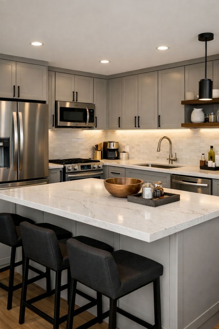 The kitchen is a modern masterpiece, combining functionality with sleek design. Custom cabinetry in a soft, matte finish provides ample storage, while the countertops are crafted from durable quartz with a subtle veining pattern. Stainless steel appliances are seamlessly integrated, offering state-of-the-art technology for culinary enthusiasts. A large island sits at the center, providing additional workspace and seating for casual dining. Under-cabinet lighting highlights the kitchen's clean lines and enhances its contemporary aesthetic.