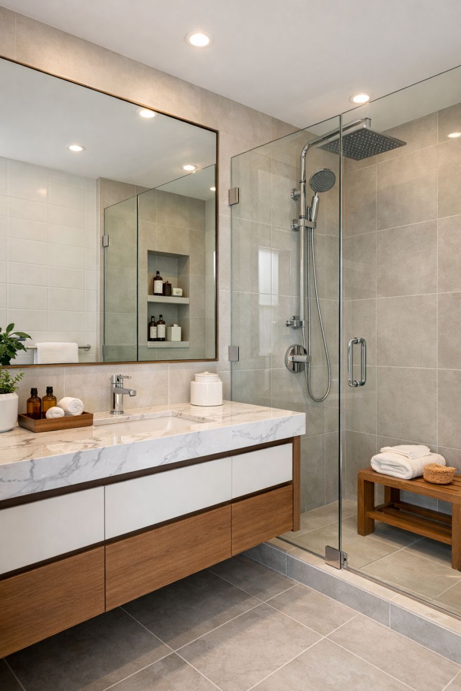 The bathroom is a sanctuary of modern design, featuring high-quality materials and a calming color scheme. The walls are clad in elegant ceramic tiles, while the floor boasts a durable and stylish porcelain. A sleek vanity with a marble countertop provides ample space for daily essentials, and a large mirror enhances the sense of space. The walk-in shower, enclosed in clear glass, features both a rain showerhead and a handheld option, offering a luxurious bathing experience. Overall, the bathroom combines functionality with a touch of spa-like luxury.
