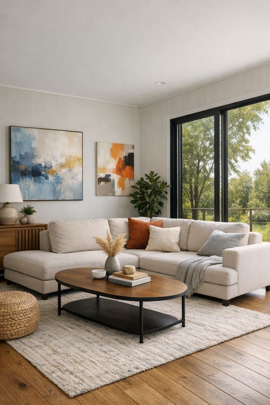 Upon entering the living area, one is greeted by an open and airy space bathed in natural light. The walls are painted in soft, neutral tones, creating a calming backdrop for the thoughtfully curated furniture. A plush sectional sofa beckons you to unwind, while a sleek, modern coffee table sits at its center. The room is tastefully accented with a few pieces of abstract art, adding a splash of color and personality. Large windows provide a seamless connection with the outdoors, further enhancing the sense of space and tranquility.