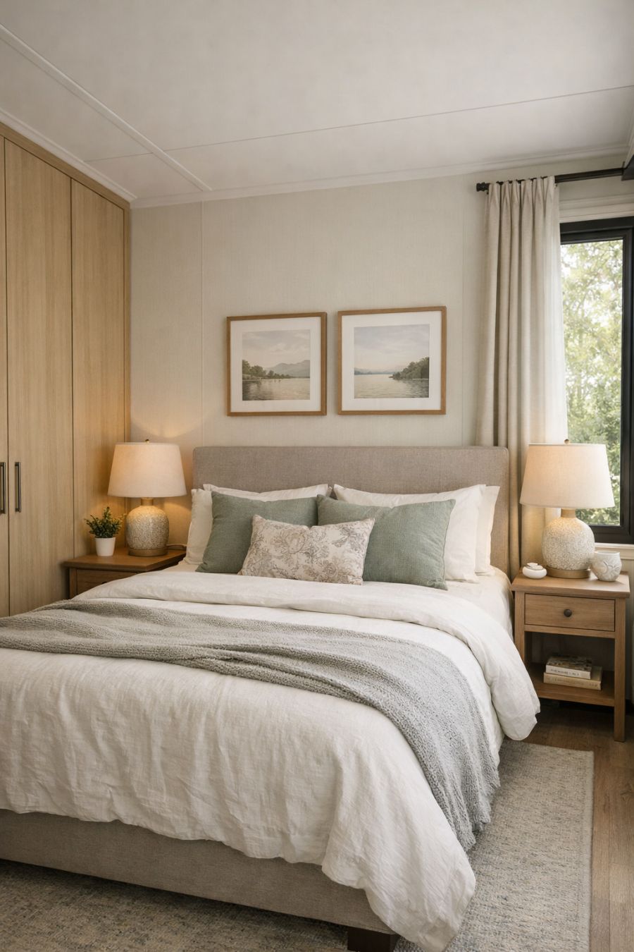 The bedroom is a peaceful retreat designed for relaxation and rest. The centerpiece, a comfortable queen-sized bed, is dressed in luxurious linens and flanked by stylish nightstands. A large window allows natural light to fill the space, while soft drapes offer privacy when needed. The color palette is soothing, with muted tones and subtle patterns that create a serene atmosphere. A built-in wardrobe offers ample storage, keeping the room uncluttered and tranquil. The overall design encourages a restful night's sleep and a peaceful start to each day.