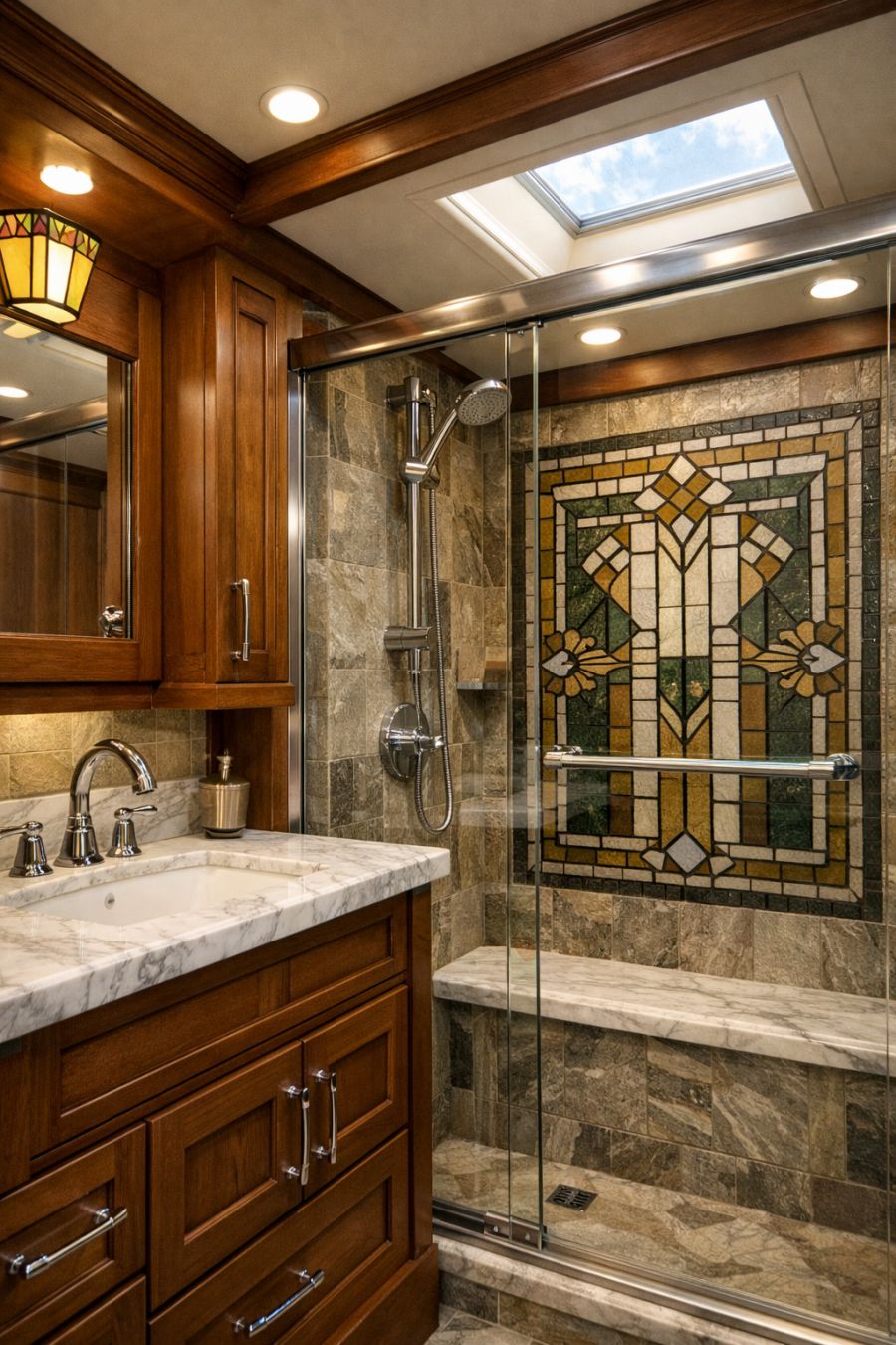 The bathroom in this luxurious camper is a study in style and functionality, featuring high-end materials and thoughtful design. Elegant marble countertops offer a sophisticated touch, while custom wooden cabinetry provides ample storage. The shower is enclosed with glass, featuring intricate tile work that echoes the stained glass motifs found throughout the camper. A skylight ensures the space is bathed in natural light, enhancing the airy, open feel of the room. Modern fixtures in polished chrome add a sleek, contemporary edge, marrying function with the timeless beauty of Craftsman design.