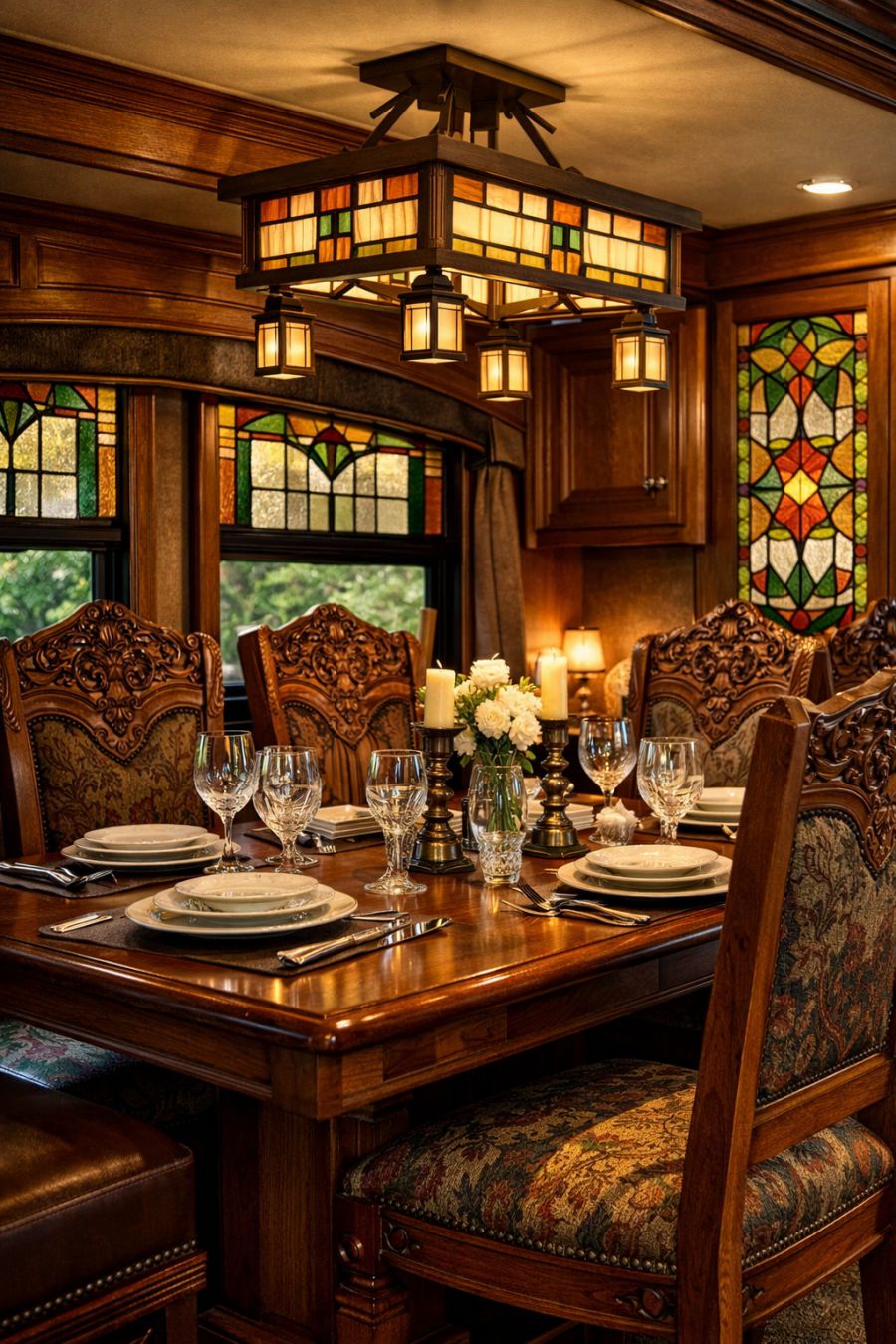 The dining area is a seamless extension of the living space, featuring a bespoke wooden table surrounded by intricately carved chairs, each a testament to skilled craftsmanship. Stained glass windows frame the space, their vibrant hues echoing the thoughtful design of the living area, and casting beautiful patterns across the polished wood surfaces. The table itself is set with fine china and crystal, underscoring the luxurious nature of this deceptively simple camper. An elegant chandelier, designed in the Craftsman style, hangs overhead, providing a warm glow that invites lingering meals and convivial gatherings.