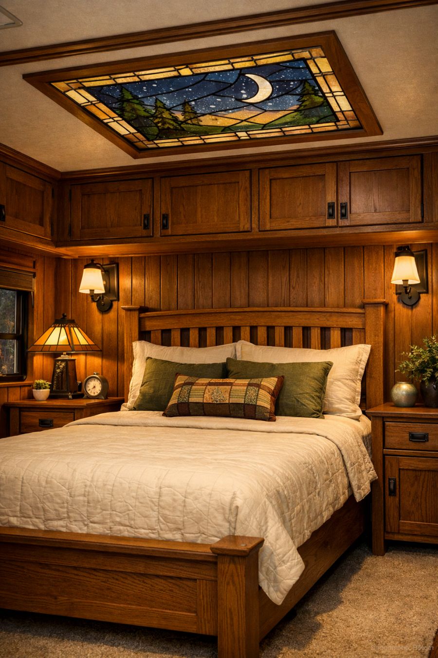 The bedroom area is a tranquil escape, embodying the same classic Craftsman charm evident throughout the camper. A queen-sized bed, with a meticulously crafted wooden frame, serves as the room's centerpiece, flanked by matching nightstands that offer both style and practicality. The walls are adorned with warm, natural wood paneling, creating a cocoon of comfort and serenity. Above the bed, a stained glass skylight provides a glimpse of the stars at night, enhancing the room's serene ambiance and fostering a deep connection with the surrounding natural world.