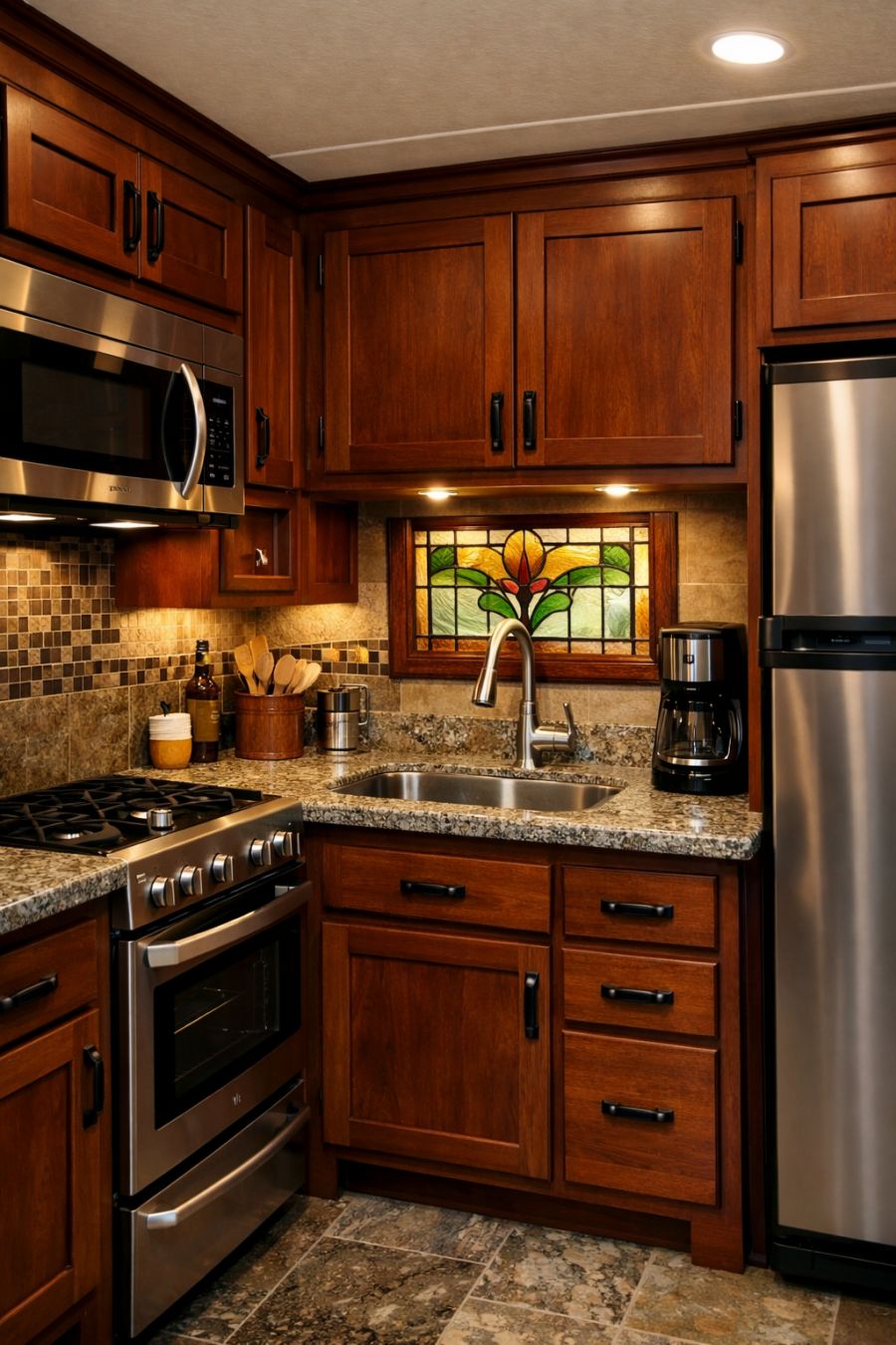 The kitchen area, though compact, is a marvel of efficient design and aesthetic beauty. Custom cabinetry, crafted from rich mahogany, offers ample storage while maintaining the Craftsman theme with its simple lines and sturdy construction. Countertops are made of polished granite, providing a durable yet elegant workspace for culinary endeavors. Modern appliances are seamlessly integrated into the design, ensuring that the kitchen is as functional as it is beautiful. A small stained glass window above the sink allows natural light to pour in, illuminating the space with a soft, colorful glow.