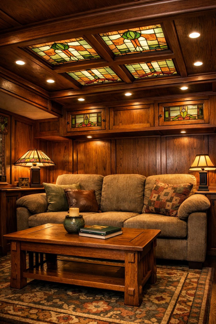 Upon entering, the living area immediately defies expectations with its classic Craftsman interior. Rich wood paneling lines the walls, exuding warmth and inviting comfort, while the ceiling is adorned with delicate stained glass inserts that cast a kaleidoscope of colors throughout the space. A plush, earth-toned sofa anchors the room, complemented by a handcrafted oak coffee table that speaks to the artisanal quality of the furnishings. Ambient lighting, carefully recessed into the paneled ceiling, highlights the intricate woodwork and stained glass accents, creating a cozy yet sophisticated atmosphere.