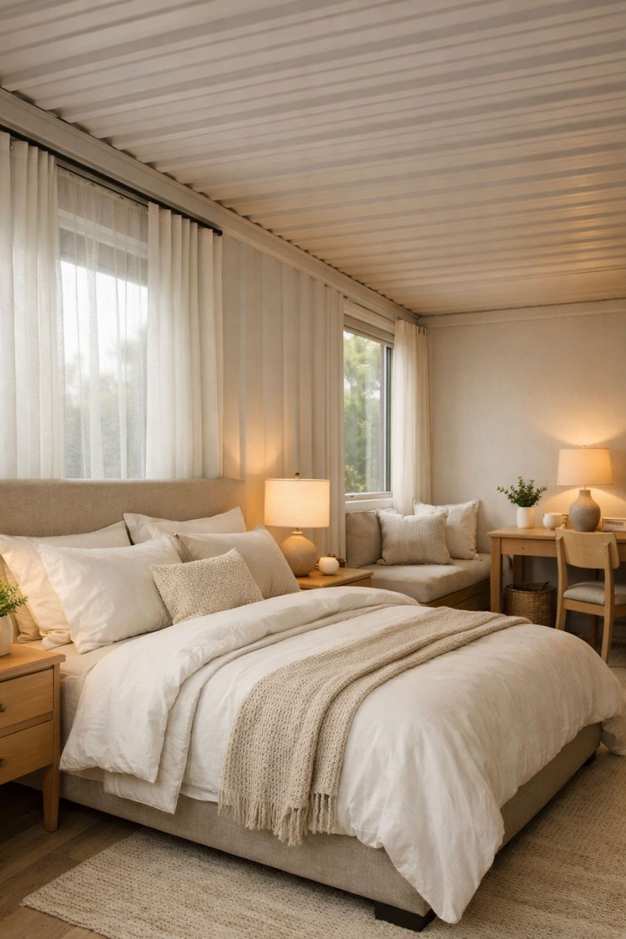 The bedroom offers a serene sanctuary, with design elements that prioritize comfort and relaxation. Soft, neutral tones dominate the space, creating a soothing environment that encourages rest and rejuvenation. A plush bed with high-quality linens takes center stage, flanked by minimalist nightstands and understated lighting fixtures that provide a warm, ambient glow. Large windows are fitted with sheer curtains, allowing for natural light to gently filter in while maintaining privacy. Thoughtful touches, such as a cozy reading nook or a small desk, enhance the room's functionality without compromising its tranquil atmosphere.