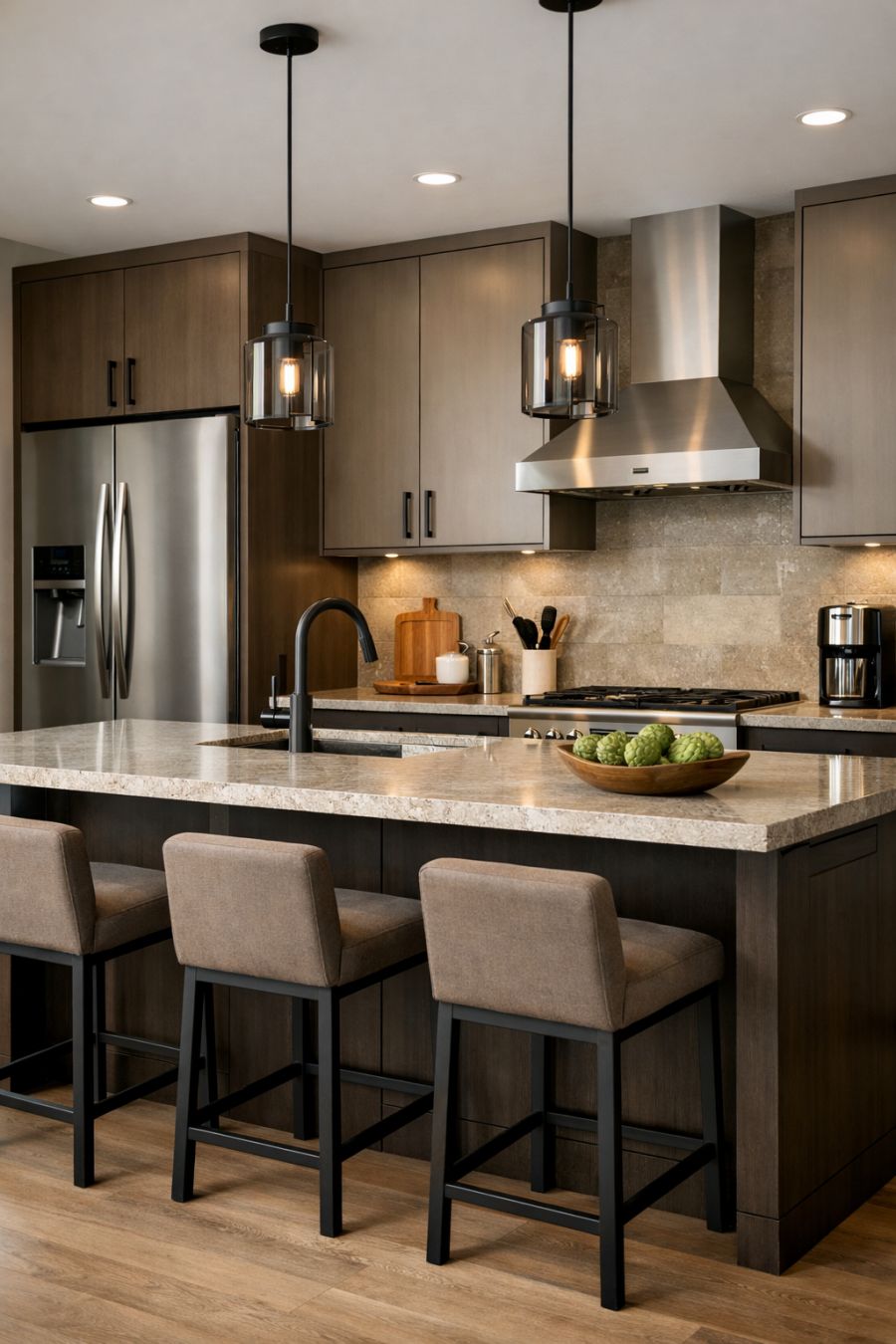 The kitchen is a masterclass in modern functionality and design, featuring state-of-the-art appliances seamlessly integrated into custom cabinetry. Its layout is both practical and stylish, with ample counter space made from polished stone that invites culinary creativity. The color palette is a sophisticated blend of muted earth tones with stainless steel accents, ensuring a clean and contemporary aesthetic. An island with bar seating provides a casual dining option and serves as a hub for social interaction, making this kitchen both a workspace and a gathering point.