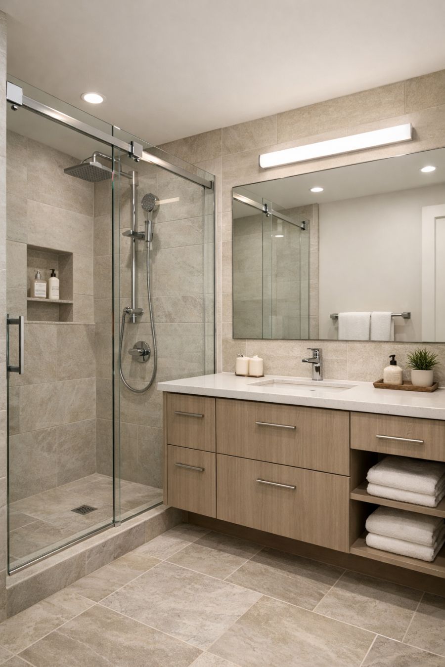 The bathroom is a harmonious blend of style and practicality, featuring a clean, minimalist design that emphasizes both functionality and elegance. The space is dominated by a spacious walk-in shower with glass doors, accented by sleek chrome fixtures that add a touch of modernity. Natural stone tiles in soft, neutral shades cover the floors and walls, creating a cohesive and calming environment. The vanity area, with its streamlined cabinetry and expansive mirror, offers ample storage while maintaining the bathroom's uncluttered aesthetic. Subtle lighting enhances the room's serene ambiance, making it a perfect retreat within the home.