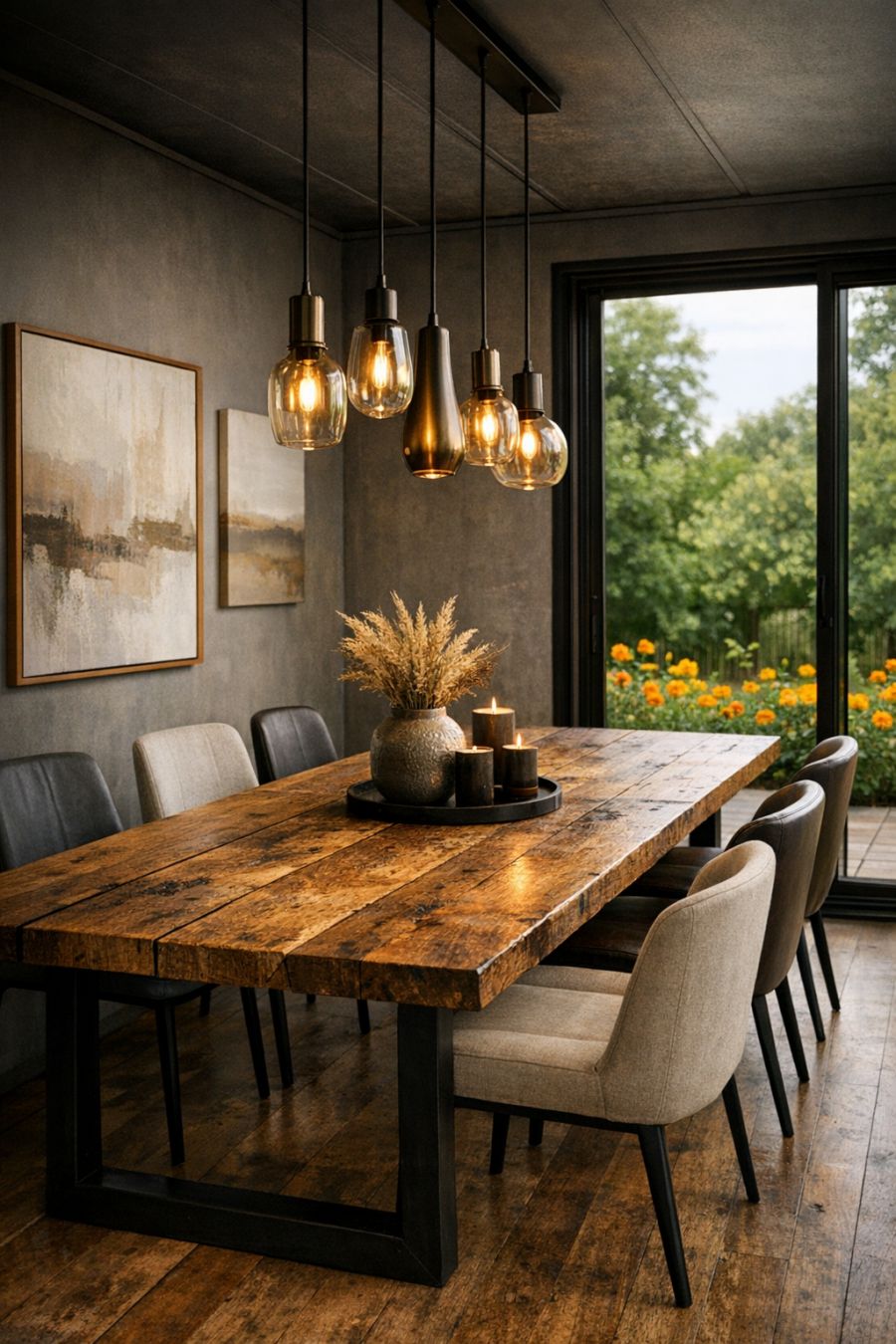 Adjacent to the living area, the dining space continues the theme of understated luxury with its carefully curated design. A sleek, elongated dining table crafted from reclaimed wood stands at the center, surrounded by contemporary chairs that promise comfort and style. Above, a series of pendant lights cast a warm glow, highlighting the table’s natural grain and setting the perfect ambiance for intimate gatherings. The walls are adorned with subtle artworks that complement the home's color scheme, while large windows offer views of the marigold-bordered exterior, blurring the lines between indoors and out.
