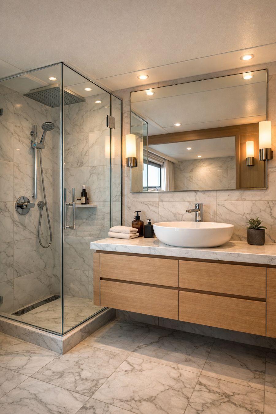The bathroom combines functionality with a sleek, modern design. Elegant marble tiles line the floor and walls, creating a luxurious yet understated look. The walk-in shower features a frameless glass enclosure and a rainfall showerhead, providing a spa-like experience. A floating vanity with a vessel sink offers ample storage, while the large mirror above enhances the room's spacious feel. Soft lighting fixtures add warmth, illuminating the space with a gentle glow that invites relaxation and rejuvenation.