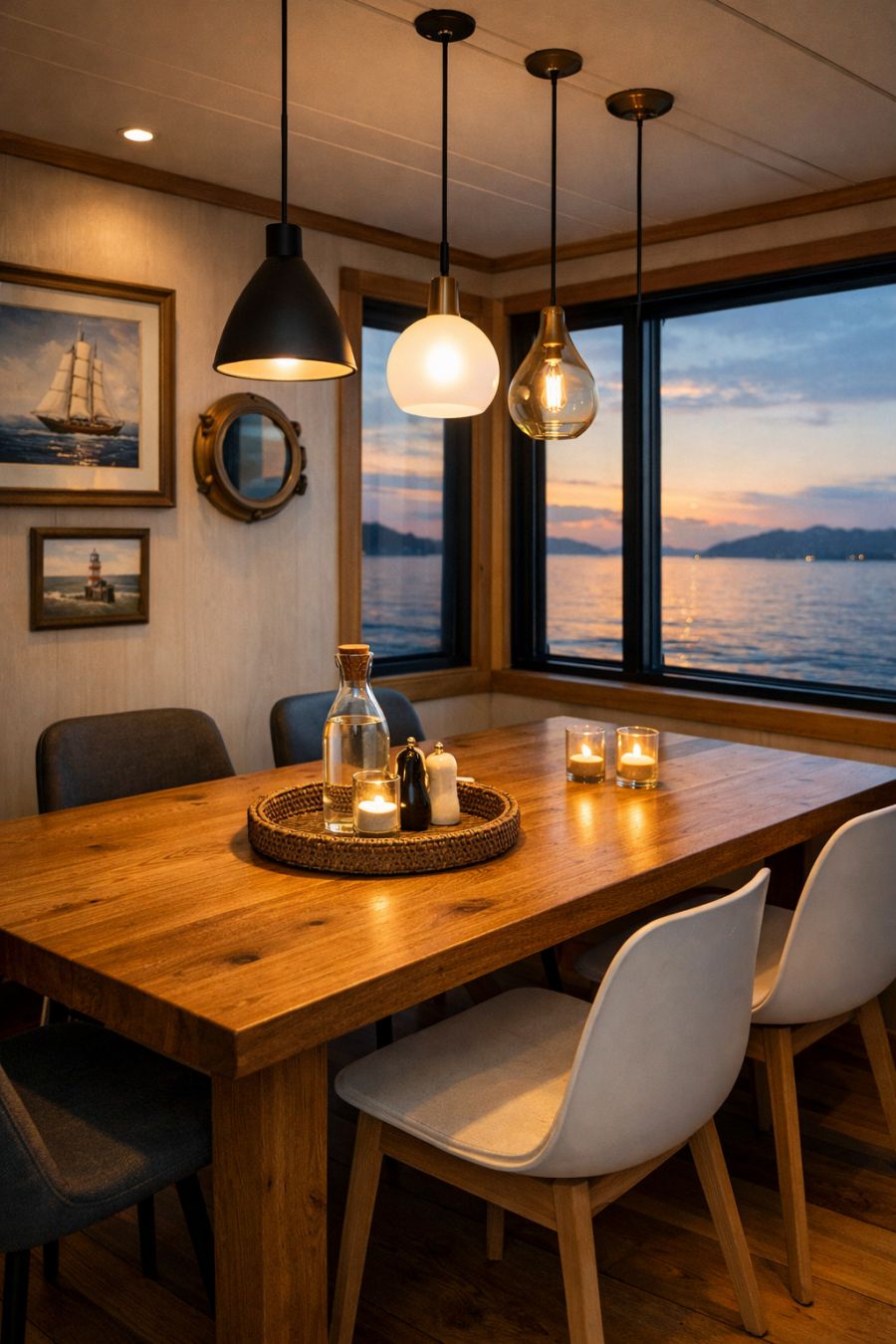 The dining area is a harmonious blend of elegance and simplicity, designed to enhance the pleasure of shared meals. A sturdy oak dining table takes center stage, surrounded by modern chairs with sleek lines. Pendant lights hang overhead, casting a gentle glow that sets a perfect ambiance for dinner gatherings. The walls are adorned with maritime-inspired art, complementing the boat's overall theme. Large windows continue here, offering diners an unobstructed view of the surrounding seascape, making every meal feel like a special occasion.