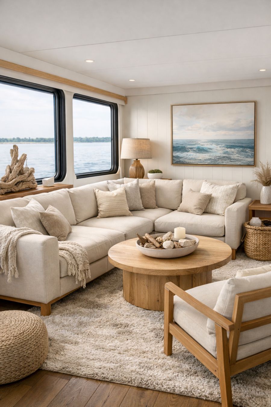 Step inside to discover a living area that marries comfort with style. The space is adorned with plush, neutral-toned furnishings that invite you to sit back and unwind. Large windows line the walls, flooding the room with natural light and providing breathtaking views of the water from every angle. The decor leans towards a minimalist aesthetic, with subtle nautical accents such as driftwood sculptures and ocean-themed artwork. Soft, textured rugs underfoot add warmth and coziness, making this living area a perfect retreat.