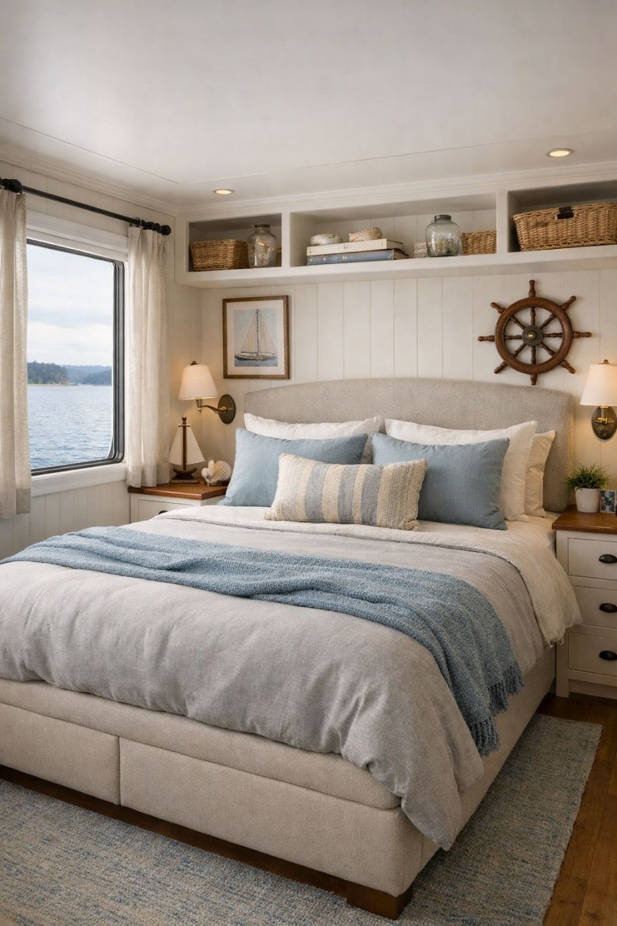 The bedroom offers a sanctuary of tranquility, with a focus on comfort and style. A king-sized bed, dressed in soft linens and plush pillows, becomes the focal point of the room. The color palette is kept neutral, with calming blues and soft grays that echo the seascape outside. Built-in storage solutions keep the space clutter-free, while nautical-themed decor adds subtle character without overwhelming the senses. Large windows frame picturesque views, allowing you to wake up to the beauty of nature every day.