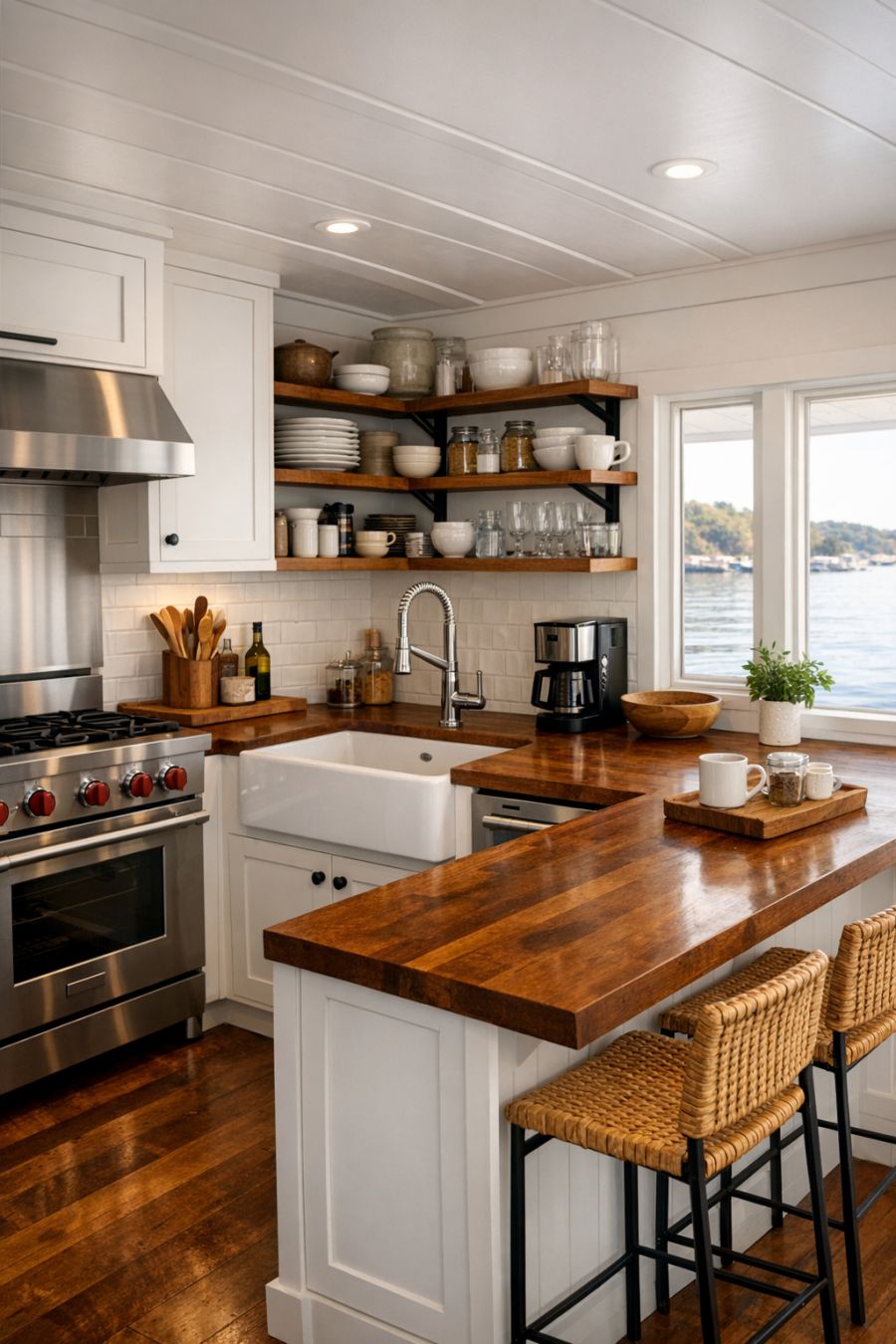 The kitchen is a chef's dream, combining practicality with aesthetic appeal. Crisp white cabinetry contrasts beautifully with the deep, rich tones of the wooden countertops. State-of-the-art stainless steel appliances promise efficiency and ease, while a large farmhouse sink adds a touch of rustic charm. Open shelving displays a curated collection of ceramics and glassware, adding a personal touch to the space. A small breakfast bar offers a casual spot for morning coffee, bathed in the natural light that pours in from the adjacent windows.