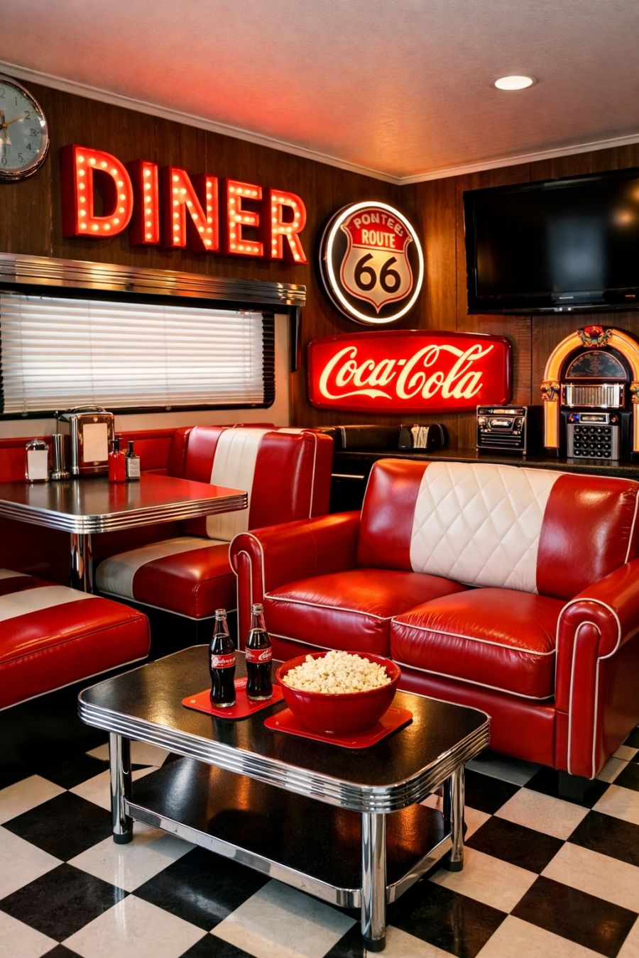 Stepping inside, the living area immediately transports you to a different era. The design is heavily inspired by a classic 1950s retro diner, with bold patterns and vibrant colors dominating the space. Vinyl booth seating in bright reds and whites lines one side of the room, while checkered black and white flooring completes the nostalgic look. Chrome accents and neon signs further enhance the retro atmosphere, making this living area a lively yet cozy spot for relaxation and entertainment.