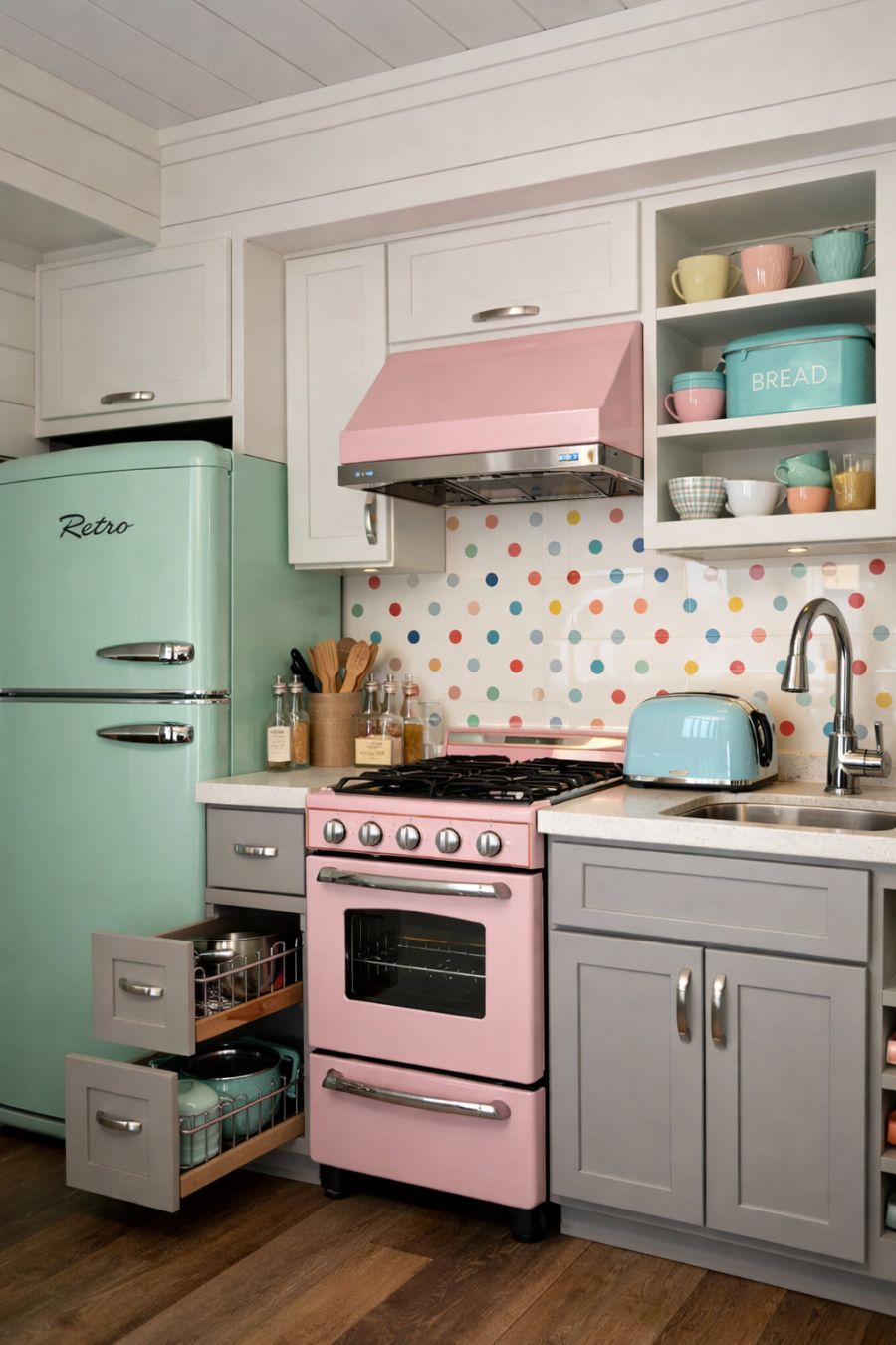 The kitchen is a delightful blend of retro charm and modern convenience. Classic pastel-colored appliances, reminiscent of the 1950s, are paired with sleek, contemporary countertops and cabinetry. The backsplash features a playful polka dot pattern, adding a whimsical touch to the space. Despite its compact size, the kitchen is thoughtfully designed to maximize functionality, with clever storage solutions and efficient layout making it a joy to cook in. The blend of old and new creates a unique culinary experience.