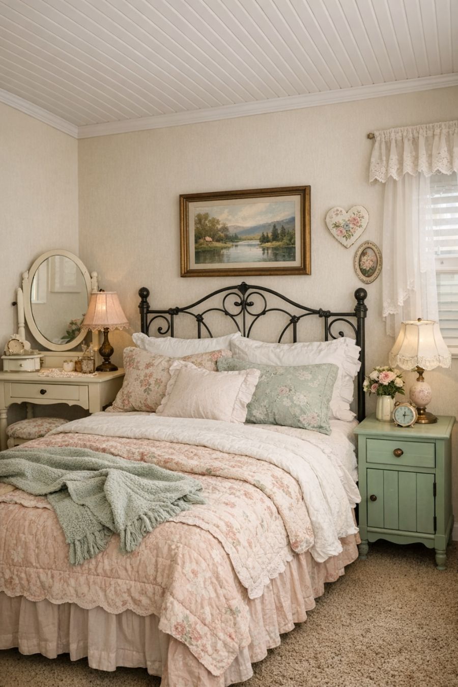 The bedroom offers a cozy retreat from the lively retro vibe found in the rest of the home. Soft pastel tones dominate the space, creating a calming and restful environment. Vintage-inspired furnishings, such as a wrought iron bed frame and a small vanity, add to the nostalgic feel. Plush bedding and layered textiles provide comfort, while carefully chosen decor pieces maintain the retro aesthetic. Despite its small footprint, the bedroom feels spacious and inviting, offering a perfect balance of style and comfort.