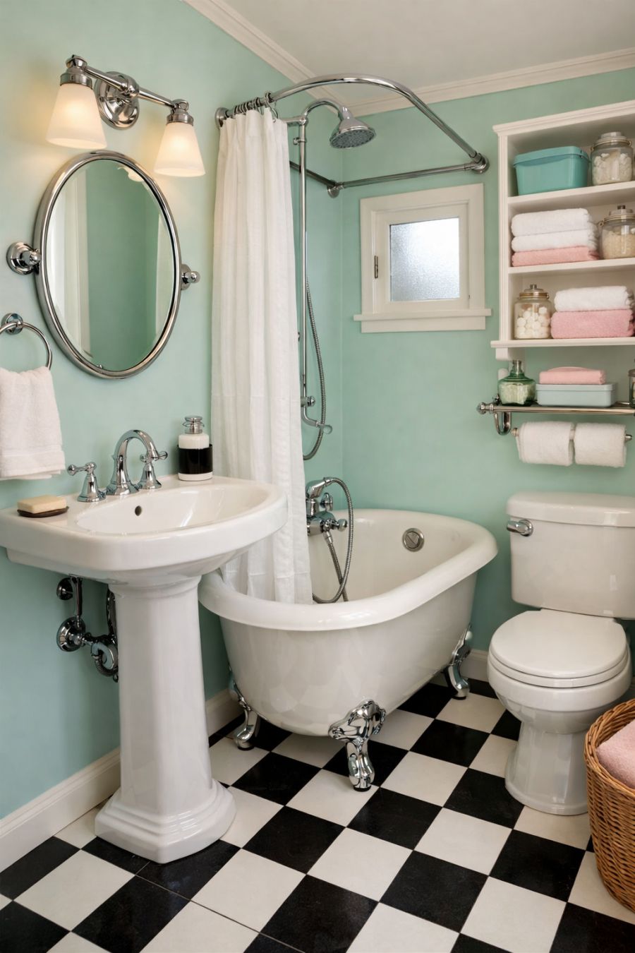 The bathroom maintains the home's retro theme while prioritizing functionality. Checkerboard tiles in black and white cover the floor, echoing the design elements found throughout the house. The fixtures are classic yet modern, with chrome finishes and soft curves reminiscent of mid-century design. A pedestal sink and clawfoot tub offer both style and practicality, while pastel-colored walls keep the atmosphere light and airy. Thoughtful storage solutions ensure the space remains uncluttered and efficient.