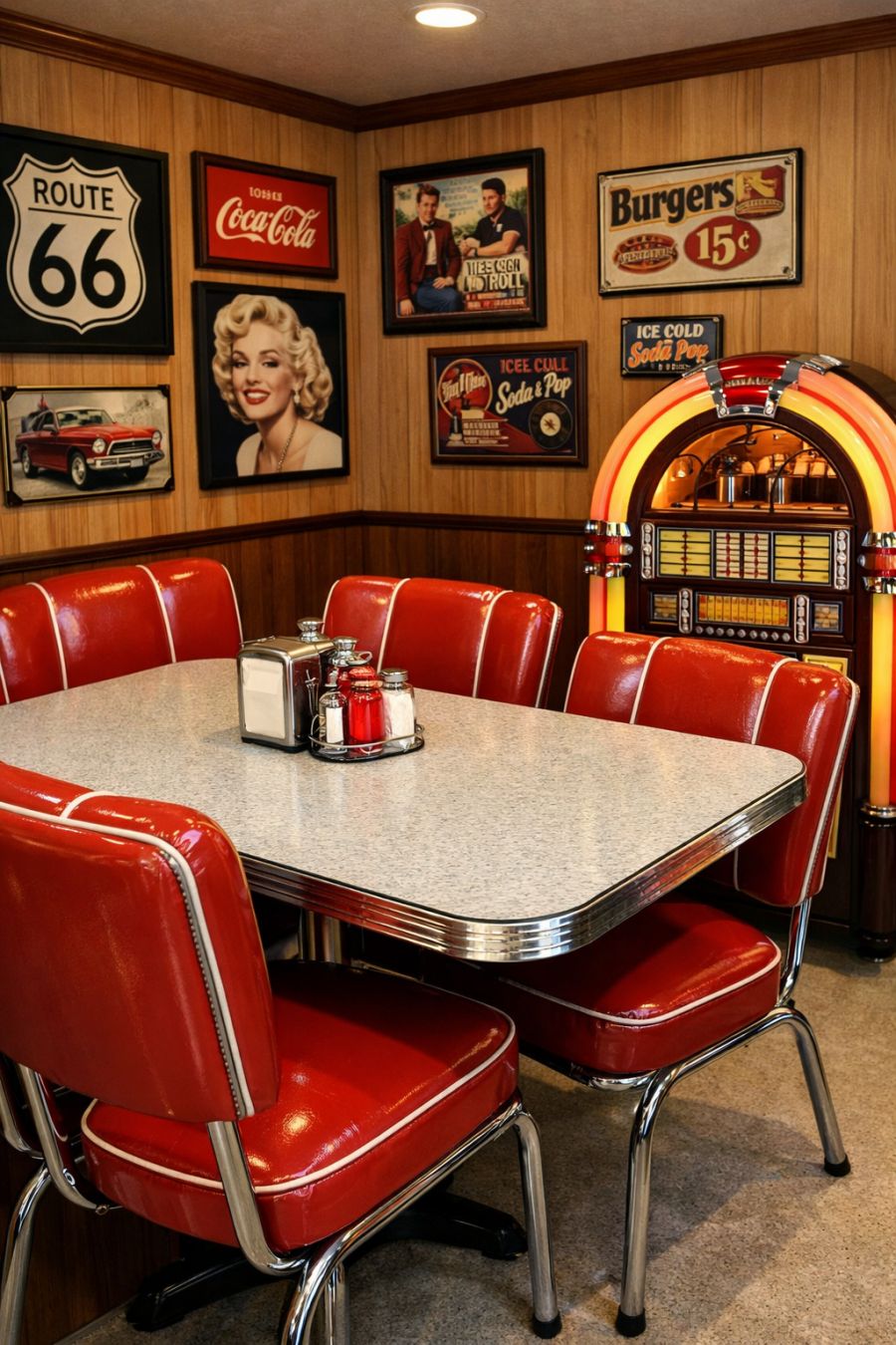 The dining area seamlessly continues the retro theme, featuring a quintessential diner-style setup. A vintage Formica table serves as the centerpiece, surrounded by chrome-edged chairs upholstered in glossy red vinyl. The walls are adorned with framed memorabilia from the 1950s, adding character and a sense of history to the space. A jukebox stands proudly in the corner, offering both a musical backdrop and a conversational starter for guests. Every meal here feels like a step back in time.