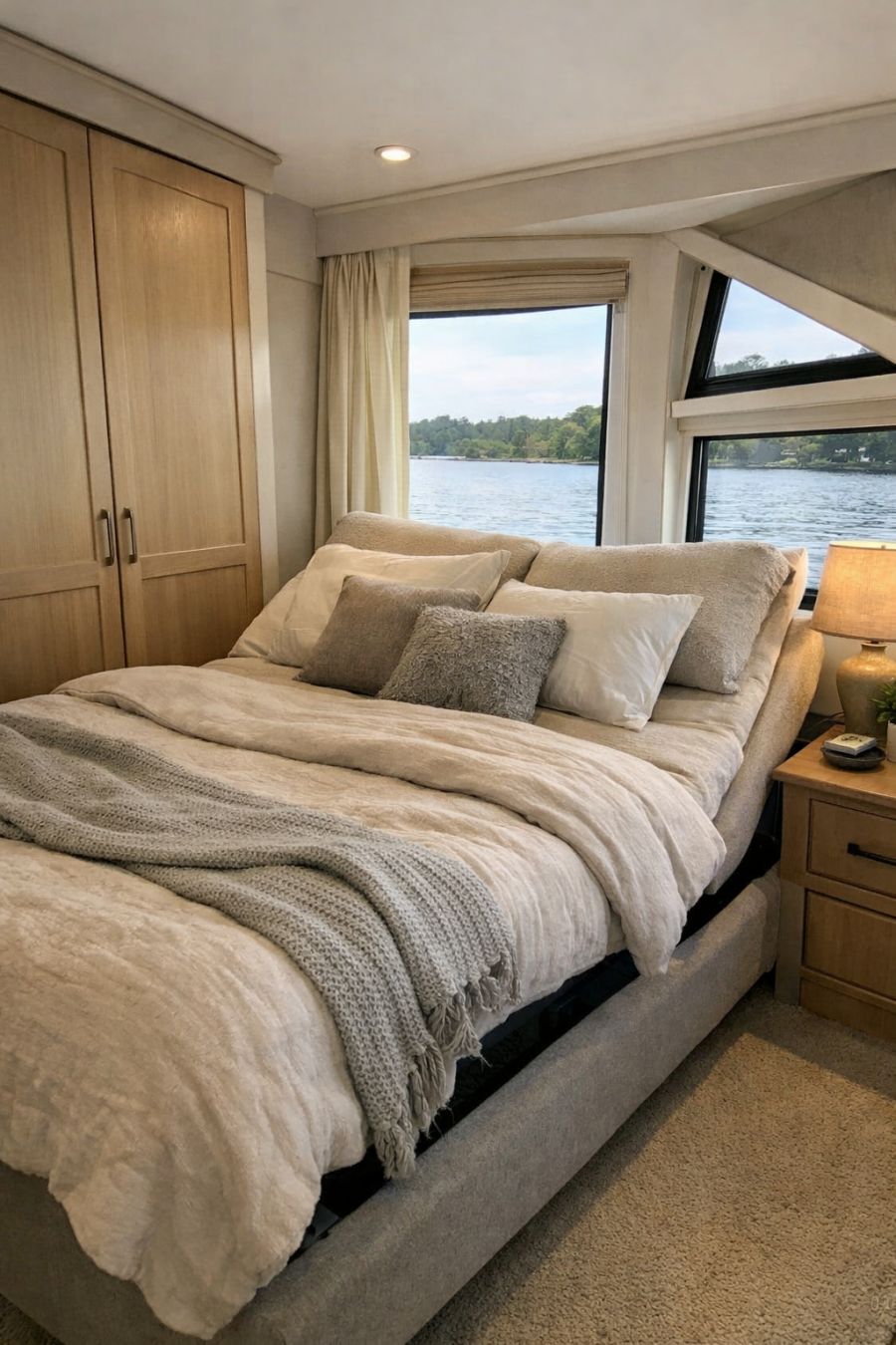 The bedroom area is a sanctuary of tranquility, offering a peaceful retreat from the outside world. It features a large, comfortable bed with an adjustable base, catering to individual preferences. The decor is simple yet elegant, with soft textiles and a muted color palette that promotes relaxation. A built-in wardrobe provides ample storage, while strategically placed windows offer stunning views of the surrounding water, allowing natural light to filter in and enhance the serene atmosphere.