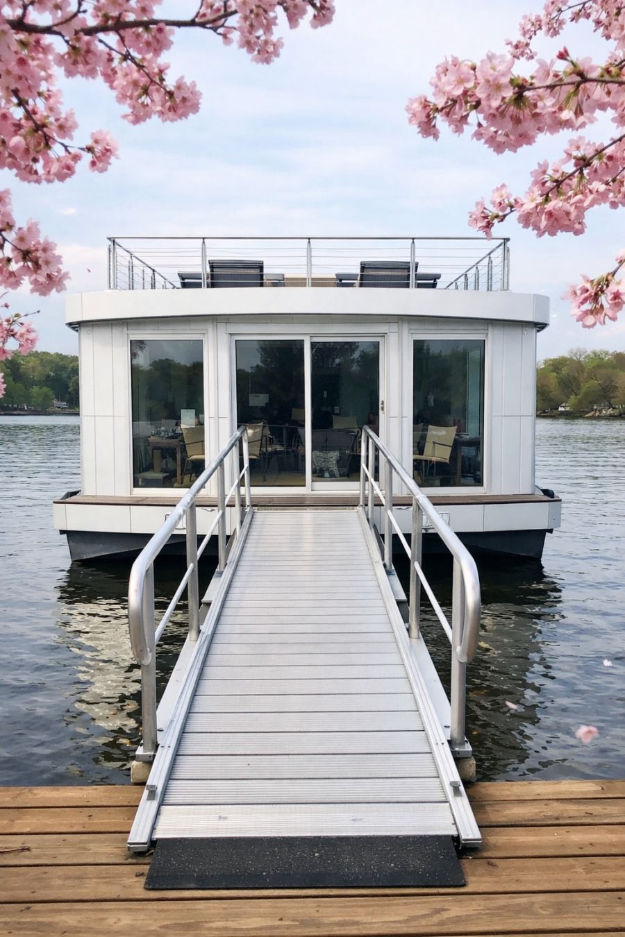 The exterior of the houseboat presents a vision of contemporary elegance with its soft white aluminum facade. This sleek design is not only visually appealing but also durable and easy to maintain. A gentle slope entry ramp invites all aboard, ensuring accessibility for everyone. Nestled among pink cherry blossom branches, the houseboat exudes a sense of peace and harmony with nature. The tranquil spring waters surrounding it provide a serene backdrop, capturing the essence of calm and relaxation, enhanced by the amateur photography that adds a touch of authenticity and warmth to the scene.