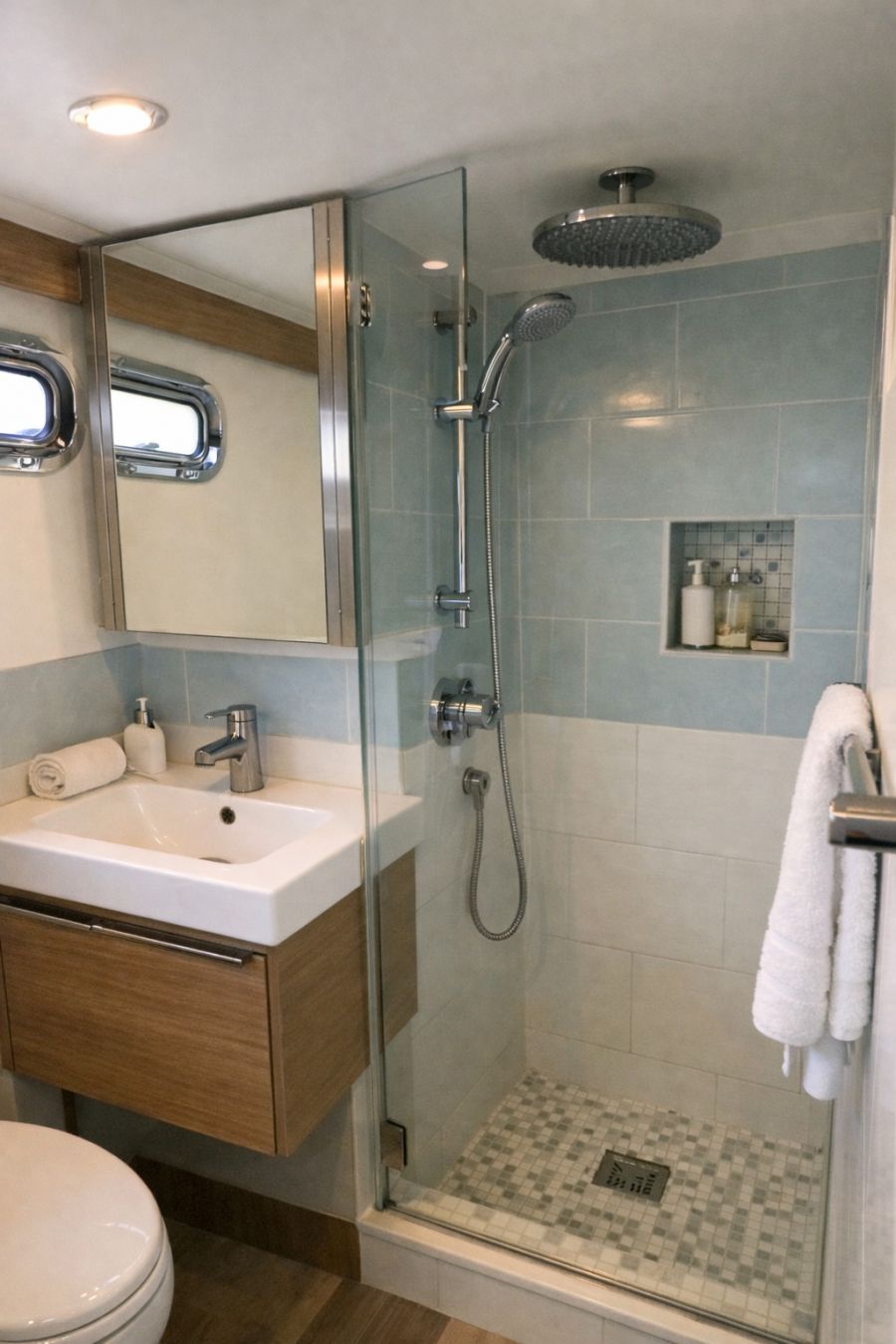 The bathroom showcases a perfect blend of style and practicality, featuring sleek fixtures and a calming color scheme of soft blues and whites. Durable materials, such as ceramic tiles and stainless steel accents, ensure longevity and ease of maintenance. A spacious, walk-in shower with a rainfall showerhead offers a luxurious experience, while a floating vanity maximizes space and provides a modern touch. The layout is designed to be user-friendly, ensuring accessibility without compromising on elegance.
