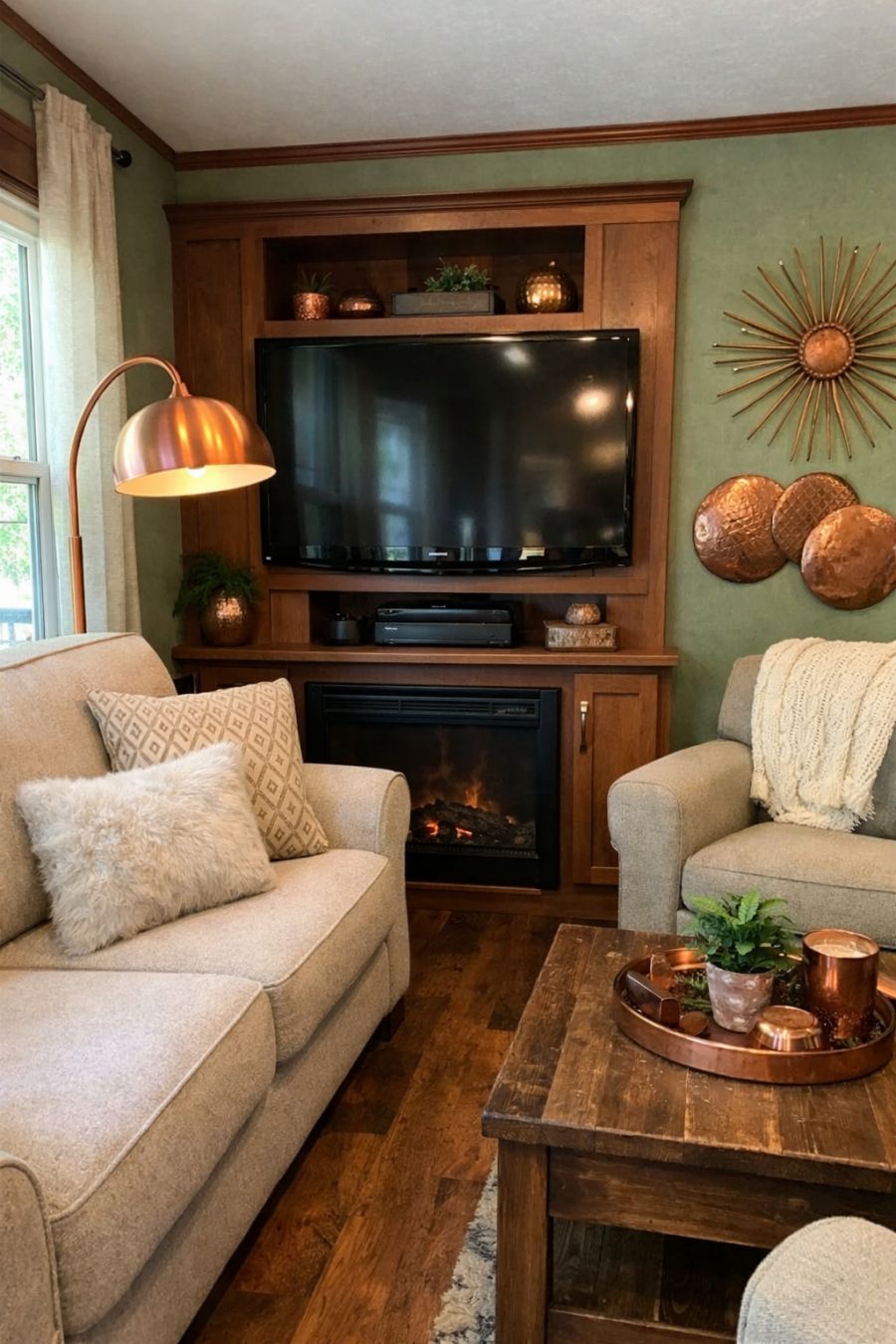 Step inside, and you'll find a living area that exudes warmth and comfort. The space is adorned with plush seating upholstered in soft, neutral fabrics, creating a cozy spot to unwind. Rich wooden floors underfoot complement the sage green walls, while strategically placed copper accents, such as a sleek floor lamp and artful wall decor, add a touch of elegance. Large windows allow natural light to flood in, highlighting the carefully curated decor elements and creating an inviting and airy atmosphere. A built-in entertainment center seamlessly integrates modern technology without sacrificing the room's aesthetic appeal.