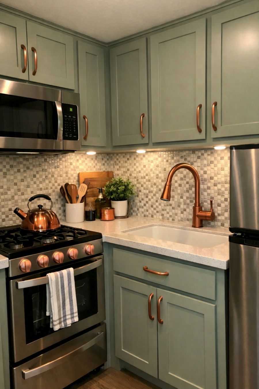 The kitchen, though compact, is a marvel of modern design, boasting efficiency and style in equal measure. Custom cabinetry painted in a soft sage green harmonizes with the overall color scheme, providing ample storage space. Copper fixtures and hardware add a touch of luxury, complementing the sleek stainless steel appliances. A quartz countertop offers both durability and elegance, while a mosaic tile backsplash adds a hint of texture and visual interest. Thoughtful lighting solutions, including under-cabinet lights, ensure the space is well-lit and functional for every culinary endeavor.