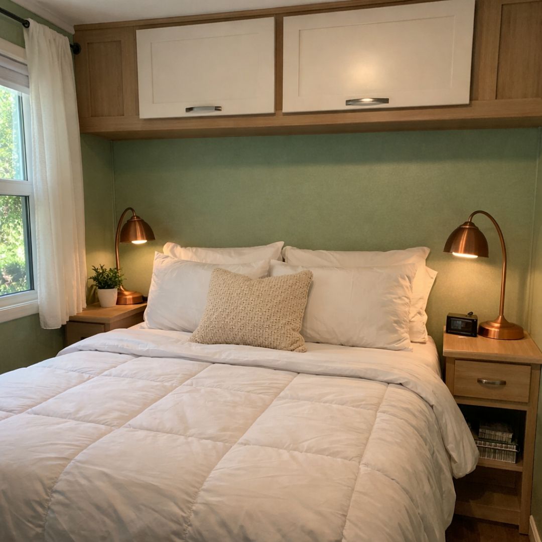 Imagine a home that perfectly balances the charm of a traditional craftsman style with the innovative compactness of a park model RV. This concept art explores the potential design of a cozy and stylish retreat, resplendent in sage green hues and accented with warm copper tones. The inspiration behind this design lies in the desire to create a space that feels both timeless and modern, offering all the comforts of a full-sized home in a delightfully petite package. It's a perfect blend of elegance and practicality, designed for those who appreciate thoughtful design and efficient living.