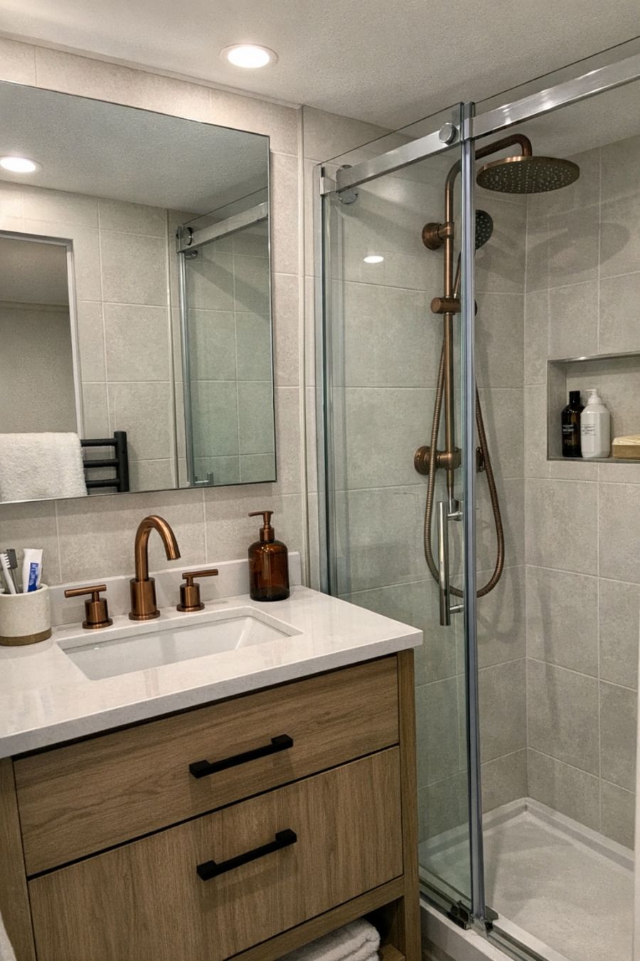 The bathroom, though compact, is beautifully designed with a focus on functionality and style. The walls are clad in light, neutral tiles that create a sense of openness and cleanliness. A sleek vanity with a copper-finished faucet provides ample storage for essentials, while a frameless mirror enhances the room's modern aesthetic. The shower features a glass enclosure and a rainfall showerhead, offering a luxurious touch. Thoughtful details, such as a heated towel rack and soft lighting, ensure that this space feels both inviting and practical, perfect for unwinding after a long day.